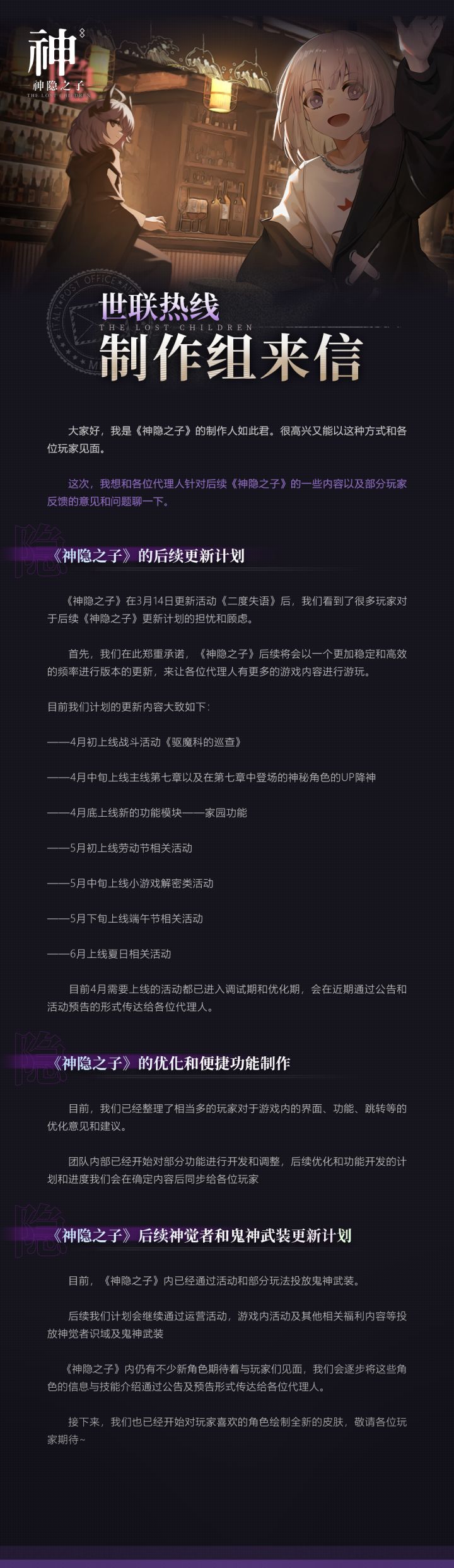 关于《神隐之子》未来更新计划的制作组来信