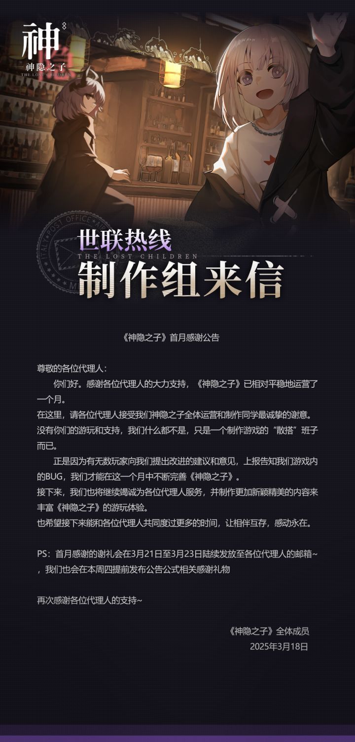 尊敬的各位代理人:《神隐之子》3月21日停服维护更新已经完成。代理人可以正常登录游戏进行游玩。相应补偿已发放至各位代理人的邮箱。2025年3月21日《神隐之子》运营团队