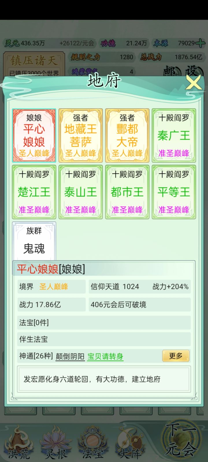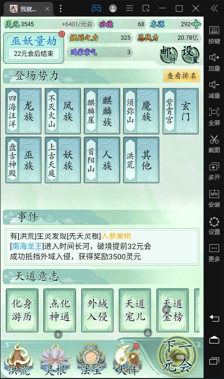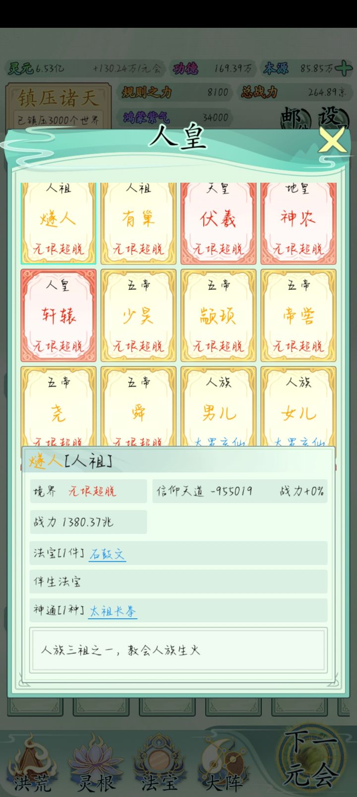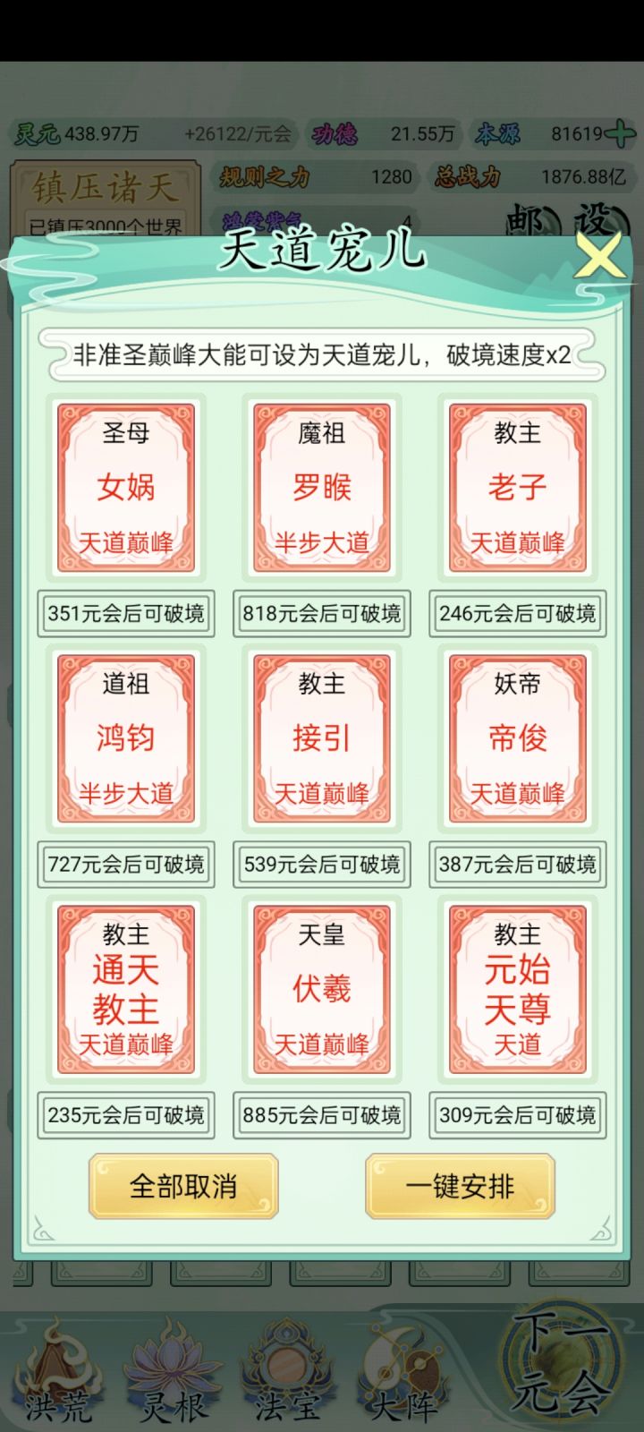 也玩了一小段时间了比不上大佬但还是说一下吧希望大家可以看见前期没灵元可以先把大阵解锁全部调整加灵元灵根尽量升满然后就是各族使命可以用推荐先全部堆灵元足够了看需求再换还有量劫一定要提前化解不然还是会发生还有就是神通和金榜个人觉得这是最主要最容易提升战力的两个方法你看你要养谁就可以给谁先学神通可以无限刷新给谁学不过需要足够的本元还有打入侵一定要百分百再打我百分之九十八被打掉境界过难受的一匹后期然后就是圣位前期能升成圣的一定要升不然战力加太慢了女娲伏羲在龙汗浩劫到准圣就可以在下一浩劫转阵容会转两次到人族之后就可以正常正道成圣了天帝和瑶池也要转阵容才能成圣后土也需要转到地狱但具体我不晓得怎么成圣我是把她地府两个橙色的升到圣人巅峰她突然就成圣了的哦对了还有天命之子可以多一倍的修行速度这个也是看你要养谁