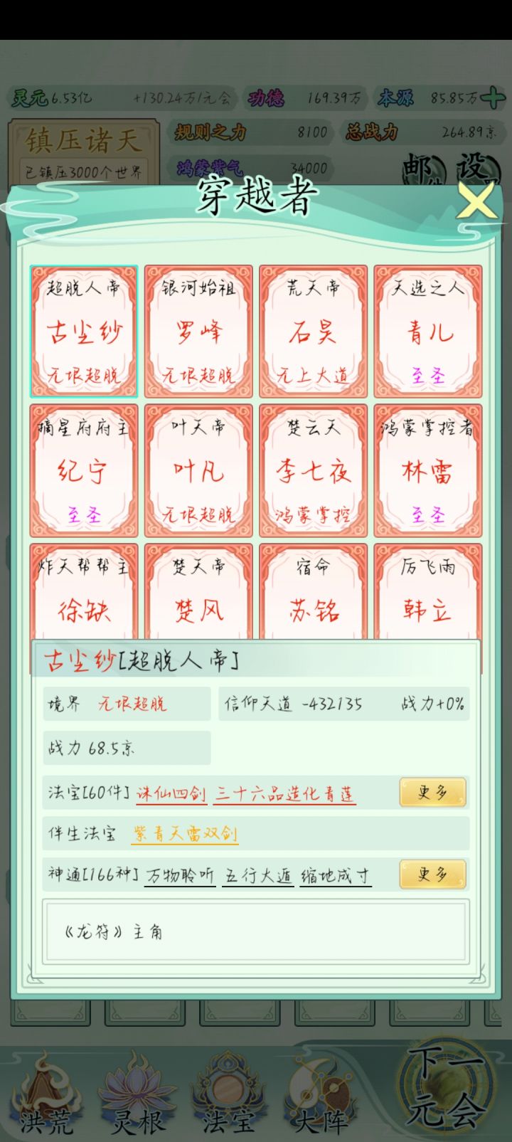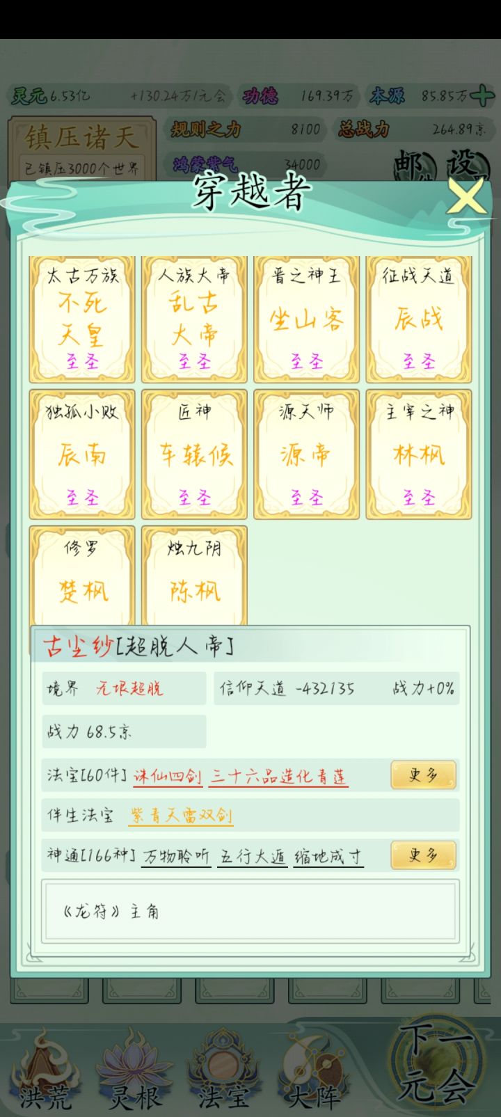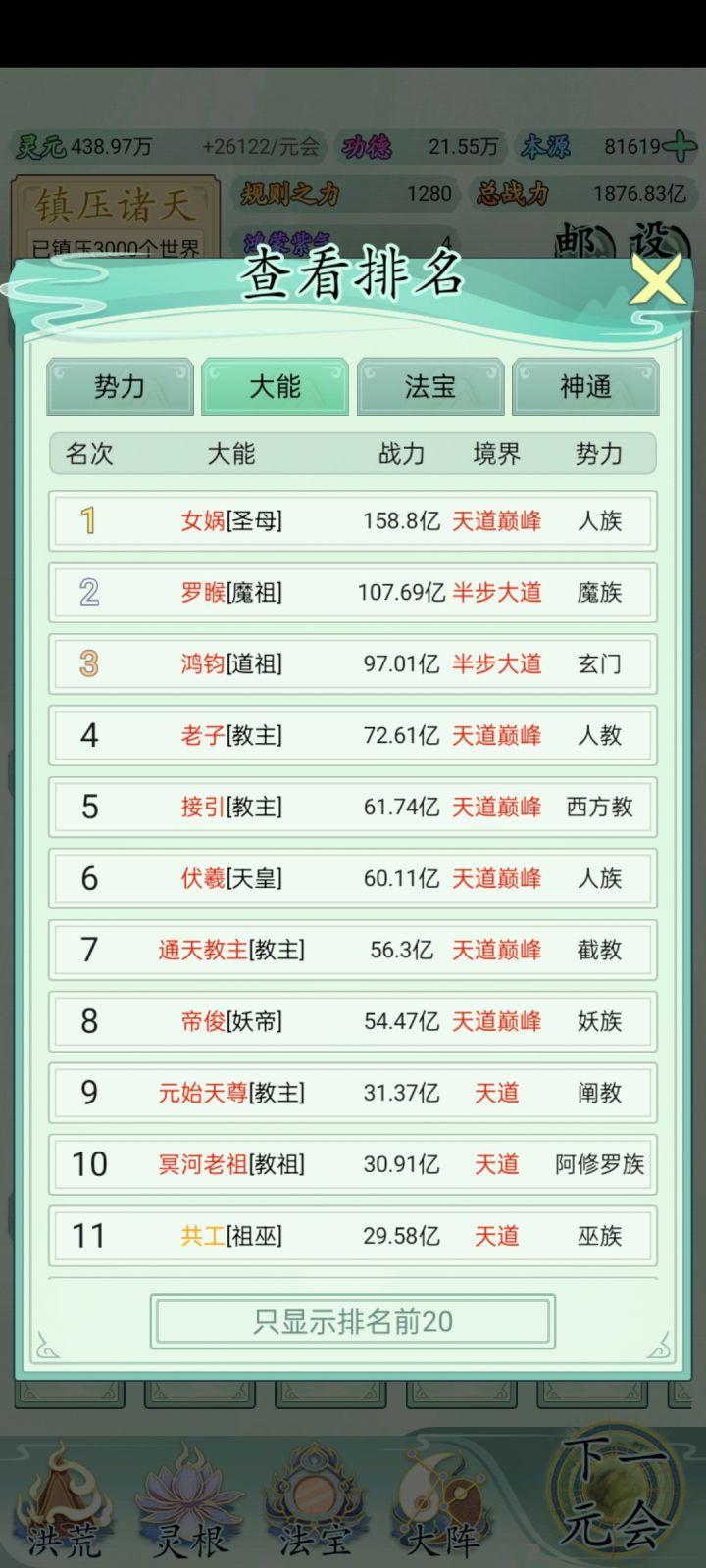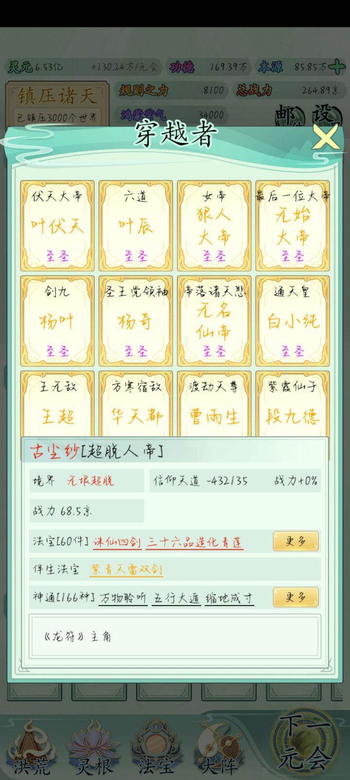 也玩了一小段时间了比不上大佬但还是说一下吧希望大家可以看见前期没灵元可以先把大阵解锁全部调整加灵元灵根尽量升满然后就是各族使命可以用推荐先全部堆灵元足够了看需求再换还有量劫一定要提前化解不然还是会发生还有就是神通和金榜个人觉得这是最主要最容易提升战力的两个方法你看你要养谁就可以给谁先学神通可以无限刷新给谁学不过需要足够的本元还有打入侵一定要百分百再打我百分之九十八被打掉境界过难受的一匹后期然后就是圣位前期能升成圣的一定要升不然战力加太慢了女娲伏羲在龙汗浩劫到准圣就可以在下一浩劫转阵容会转两次到人族之后就可以正常正道成圣了天帝和瑶池也要转阵容才能成圣后土也需要转到地狱但具体我不晓得怎么成圣我是把她地府两个橙色的升到圣人巅峰她突然就成圣了的哦对了还有天命之子可以多一倍的修行速度这个也是看你要养谁