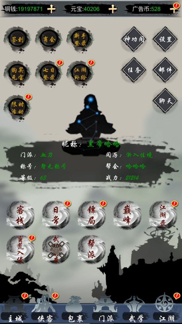 隐私政策 开发者的话一个人做游戏不容易,历时不记得多久了(原谅上年纪记忆退化---太久了),终于捣鼓出来了。 这是一款休闲放置类游戏,简单不伤肝,高度还原武侠情景,玩法搭配自由丰富,各种武林秘籍任你学习,收集装备,秘籍,学习武功阵法,更多日常交互玩法,皆在其中。 游戏没有任何内购,也不接受内购,当然为了维持游戏服务器正常运转,会有广告,但是不强制观看。不影响游戏正常流程,请各位手下留情,喜欢的可以给我多提些宝贵的意见,不喜欢的就直接卸载吧,勿喷!!