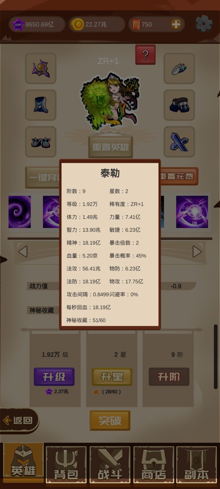 最新版本可以突破了。以前所有全部删除,昨天中午十一点开始。大家同一起跑线。肝了一天搞出个突破+1。属性加成很高。以前很多数据也修正了。吃装备不受升阶加成。升阶阶升星只对基础属性有效。
