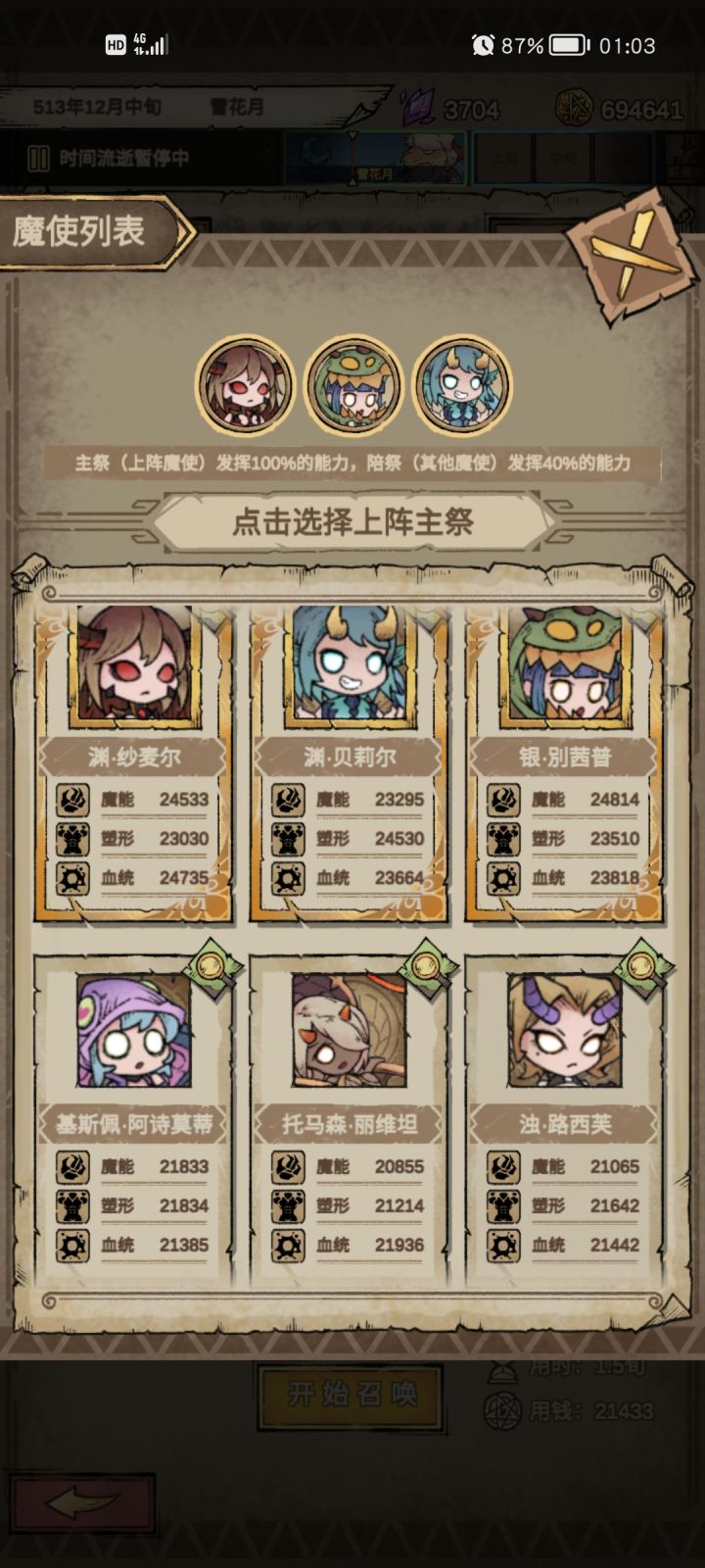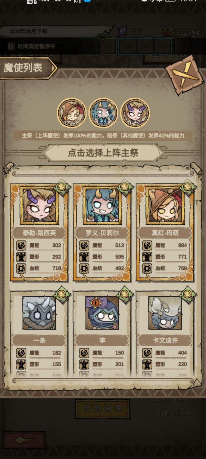 1.做完新手指引任务后,首要任务就是招聘满橙色品质罕见的魔使。前期没有可以先招几个紫色的魔使先用用,后面一边召唤怪兽攻破关卡一边刷刷落单者积累一些钱,然后用1000块钱不断招聘搜寻橙色品质的魔使。不推荐培养紫色魔使。越早招满