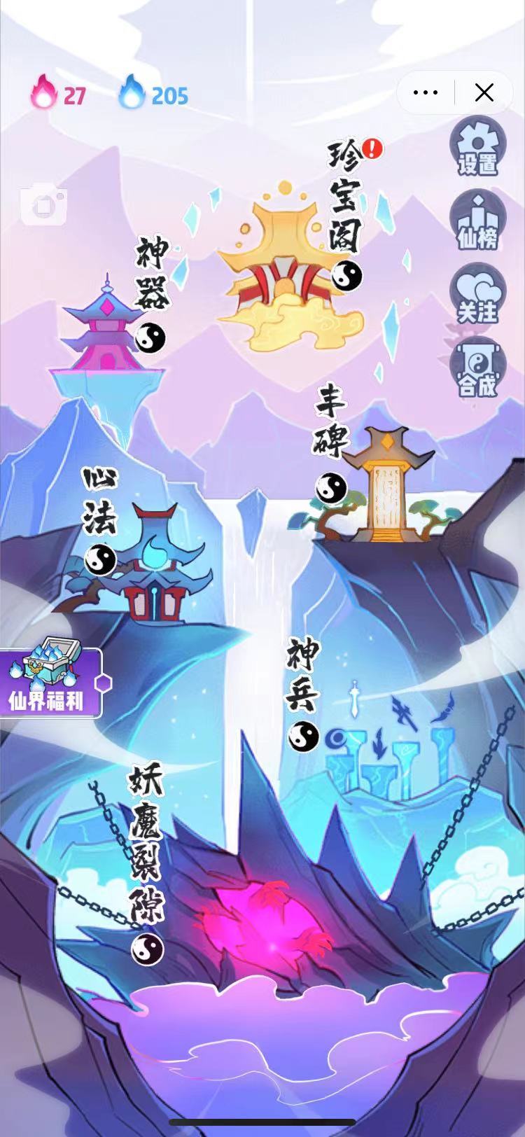 1、珍宝阁:游戏战斗中收集的武器及法宝均会在珍宝阁展示,首次激活图鉴可领取养成资源; 2、神器:战斗中攻击怪物可以积累能量,能量槽满之后自动释放神器技能,不同神器有不同养成升星条件; 3、心法:战斗宝箱、建筑物击碎及关卡结算时可大量获取仙魂来升级心法,强化主角战斗能力; 4、神兵:更换神兵改变初始攻击方式,以及培养神兵后续招式,可在神兵基础招式学习满级后捡取宝箱,概率解锁后续强力招式; 5、仙界福