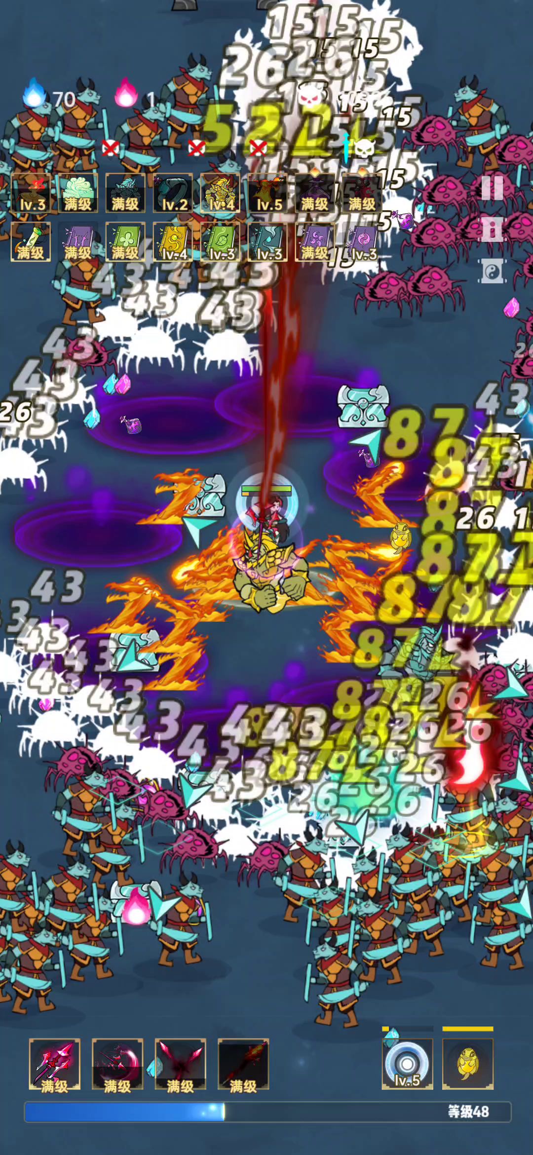 视频所见,合成前数量就很多,合成后更是附加了穿透效果,总之就是很强势。这样的法宝有缺点吗?答案是必然的,首先就是由于它的攻击范围太广了,导致大部分经验吃不到,那么走过去吃不就好了吗?这就要说第二个缺点了,用河神的话到了游戏中后期之屏幕会失灵,也就是你不能操作了,能不能过关跟你没关系了。这里就希望官方修复一下了,或者就避免使用这个法宝