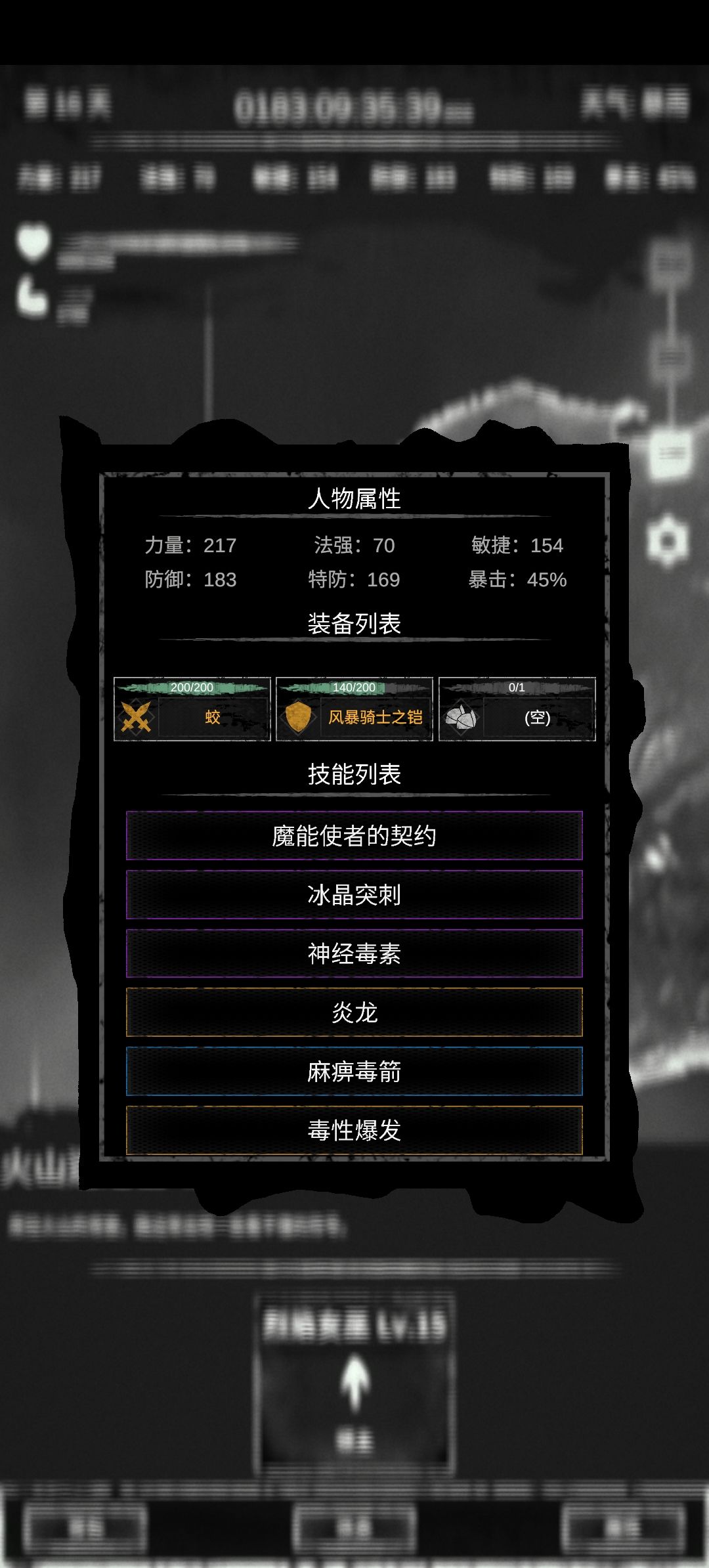 通关看开局选什么技能组。地图过一遍,金色技能都能入手。毒刺比较通用,偏后期发力。格斗适合刚开局过渡。打不过可以给角色加点 (我翻过车的两张图) 森林歌声-烈焰魔女,只需要魔女,主加特防。入手金色—魔女契约,搭配几张带“咒怨”被动的,技能成型基本就不掉血了。 (顺带一提,魔女输出有“特防”和“咒怨”两个方向。刚开局咒怨基本没输出,可以拿诅咒打击和魔女之刺。) 风骑-雷顿,只需要铁臂,主加防御。其他技能随便(最好不带风行,不点敏捷,我攻速快暴毙两次,不知道为啥~)等拿到金色—荆棘之心,站着让他敲就完了。 商店有橙色(紫色)装备想买,生存时间又不够的时候,可以先打其他区域,攒够时间再回去买。 同理,遇到打不过的怪,也可以先(逃跑)去其他区域,变强了,再回去找场子 热知识:【休息】会第X天+1,但不扣生存时间