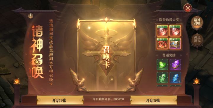 诸神召唤滴滴~前方【诸神召唤】来袭,各位勇士准备好了吗?!# 活动时间6月17日 05:00~6月18日04:59# 开启条件开服天数 86-139天 的服务器个人等级 >=500级 的角色一诸神召唤活动期间内,通过挑战英灵神殿或消耗钻石获得召唤卡。使用召唤卡可开启召唤仪式,获得7个珍稀道具奖励。在召唤仪式中,可获得稀有冠冕道具,并且在一次召唤中若同时获得“奖励”和“翻倍”字样道具