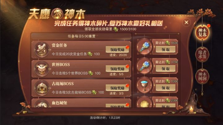 亲爱的小伙伴们大家好!天鹰神木邀你开启~完成任务得碎片复苏神木送好礼!【活动时间】:6月17日 05:00~6月19日 04:59【开启条件】:开服天数8-85天的区服&个人等级>=300级的角色一神木复苏活动期间内,每日通过完成任务获取神木碎片,当神木碎片达到一定数量时可以获得不同的奖励,随着神木碎片数量增多,奖励会越发的珍稀!玩家获得神木碎片越多,可兑换的珍稀道具种类越丰富