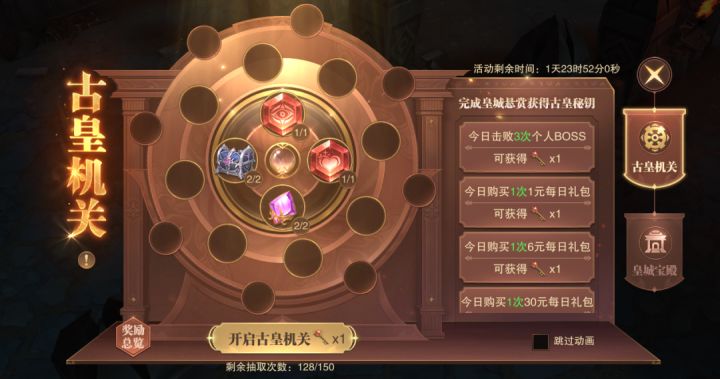 开启上古皇族珍宝宝藏收获神藏激活强力技能!古皇机关活动又来啦!手握秘钥抓住机会那个身披无上神威的人是你吗?【活动时间】6月17日 05:00 ~ 6月19日04:59【开启条件】开服140天及以上的区服&等级>=700级的角色一古皇机关活动期间,勇士们可以使用古皇秘钥在活动界面开启古皇机关,机关开启后将弹出八个可开启的宝匣,点击开启宝匣可获取珍稀奖励,每次开启宝匣还有机会获得