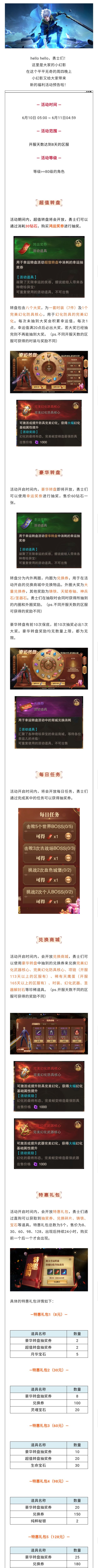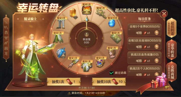 转盘连连转,大奖奖不停!各位勇士,近来的冒险还顺利吗限时活动“幸运转盘”已经开启啦!在本次活动中,我们为大家准备了大量的奖励,各种坐骑类秘宝等你拿!快和小幻影一起看看活动的情况吧!一、活动时间2024年12月13日 05:00 至 2024年12月15日 04:59二、开启条件达到开服8的区服并且等级>=80级的角色三、活动内容1、超值转盘活动开启时间内,会开放超值转盘,勇士