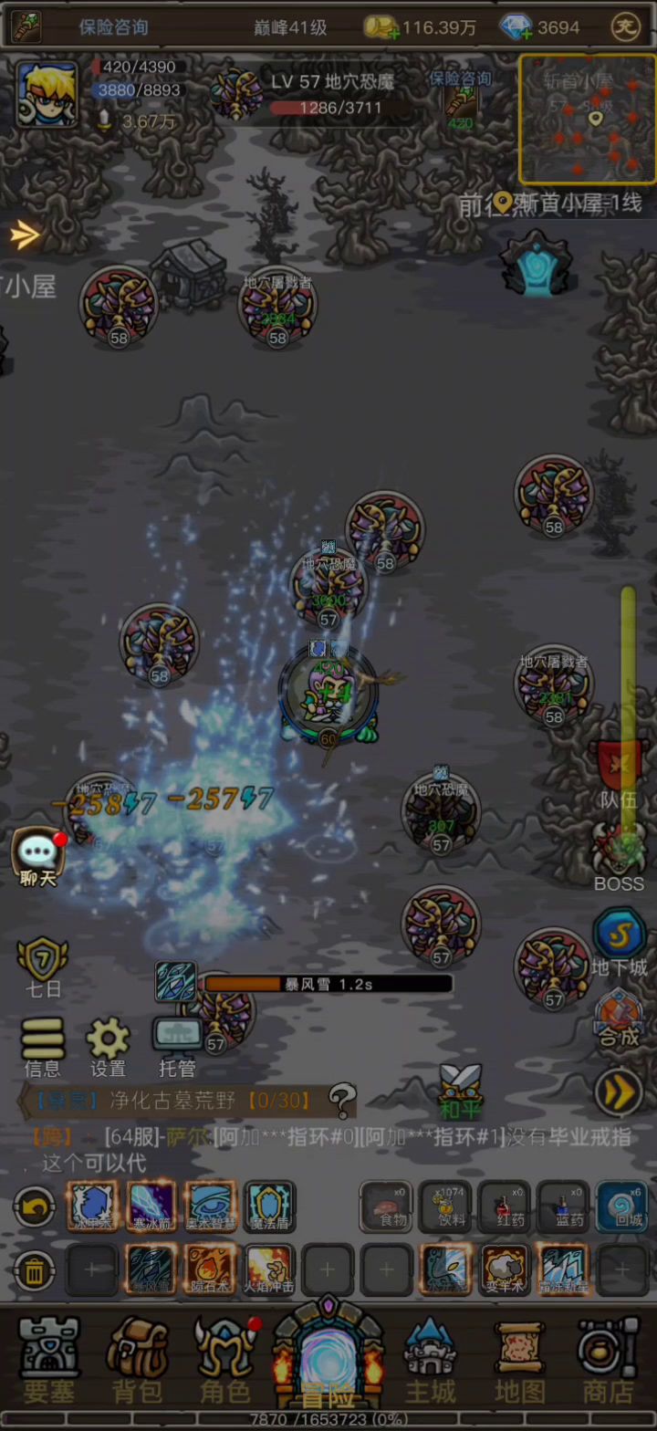 职业:法师 氪金要求:好像是要开月卡才能死了满血满蓝瞬移 技能:如图演示 不开盾就是为了死的快,开冰环是为了把怪推开然后A更多的怪过来; 死前蓝用不完最好,复活就是满血满蓝瞬移过去; 放点1级饮料是因为怕活的太久备点aoe的蓝,一晚上下来用不了几个,基本0成本、长手拉怪、效率a。