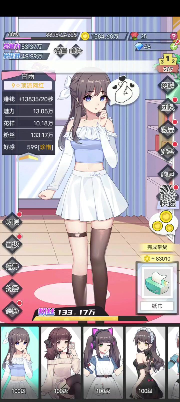 游戏总体来说可玩性还是可以的,就是造型都解锁后就有点索然无味了,而且广告蛮多的,不过也可以理解,就这一点盈利手段了嘛,多角色都满级后金币也成了没用的资源 可玩性:8⭐ 画面音乐 场景设计:7.5⭐ 角色立绘:9.1⭐(甜御 纯欲风) 肝度:9⭐(没事小窗挂着就行) ♦好感最高是【珍惜】 ♦不看广告的话很难快速获得资源 ♦金币后期没啥用 没必要特意攒 ♦【约会】性价比不高 没必要点满 #浅评一下 #