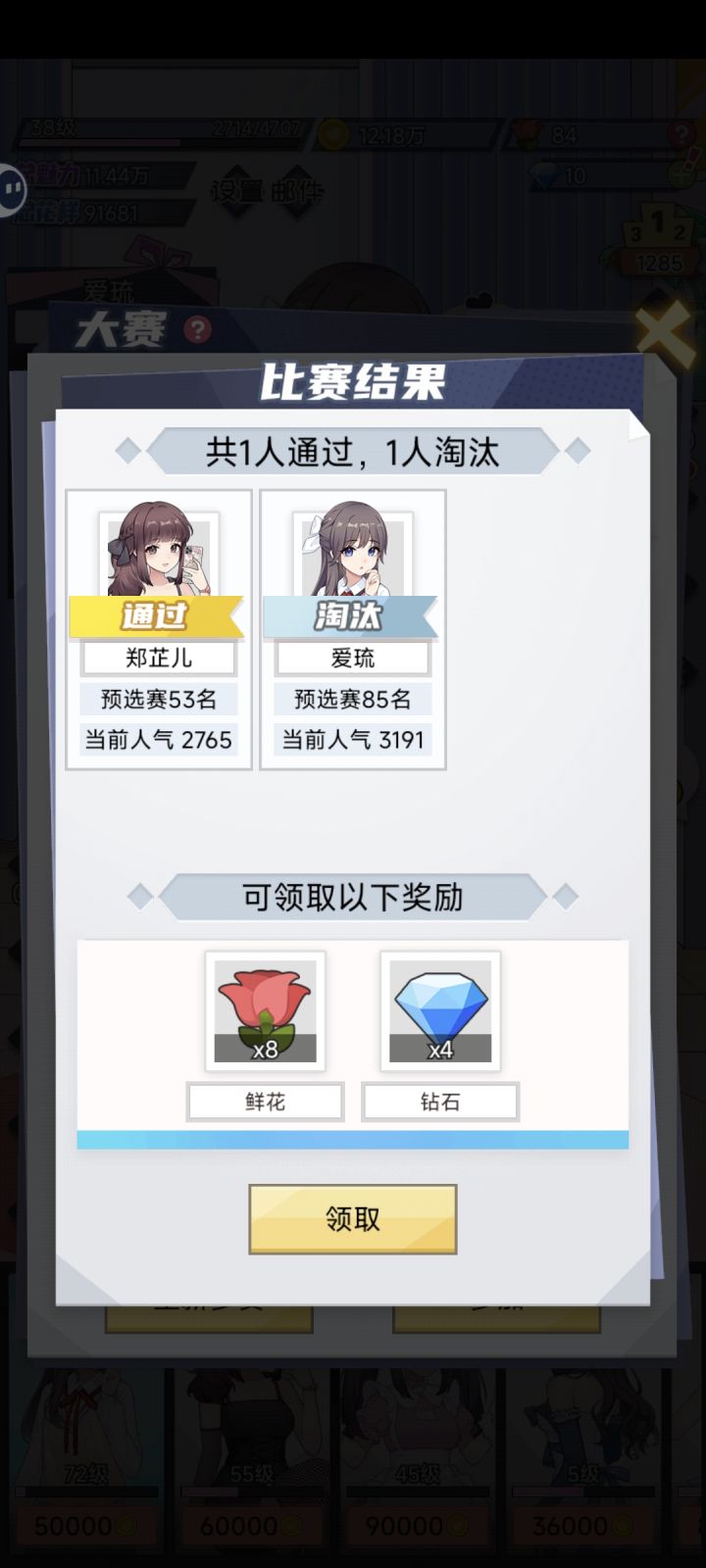 游戏总体来说可玩性还是可以的,就是造型都解锁后就有点索然无味了,而且广告蛮多的,不过也可以理解,就这一点盈利手段了嘛,多角色都满级后金币也成了没用的资源 可玩性:8⭐ 画面音乐 场景设计:7.5⭐ 角色立绘:9.1⭐(甜御 纯欲风) 肝度:9⭐(没事小窗挂着就行) ♦好感最高是【珍惜】 ♦不看广告的话很难快速获得资源 ♦金币后期没啥用 没必要特意攒 ♦【约会】性价比不高 没必要点满 #浅评一下 #