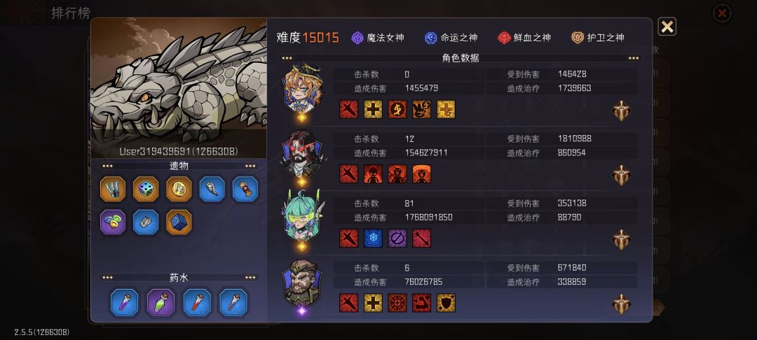 主C单核:蓄力旋风斩剑圣 辅助控制:帝刺 辅助dbuff:帝弓 辅助奶妈:帝牧 天神:征战+霜雪 主要是征战,其他天神随意 核心遗物:宝珠手链 这局药水比较天胡, 两个行动力药水(混沌药水+神恩药水) (风怒药水:攻击次数+1) (大愤怒药水:加暴击率/暴击伤害) 风怒药水对蓄力剑圣提升不大,只有平A吃效果。 风怒药水,剑圣的突击斩可以吃到效果。 能两回合结束战斗,最主要就是核心遗物(宝珠手链