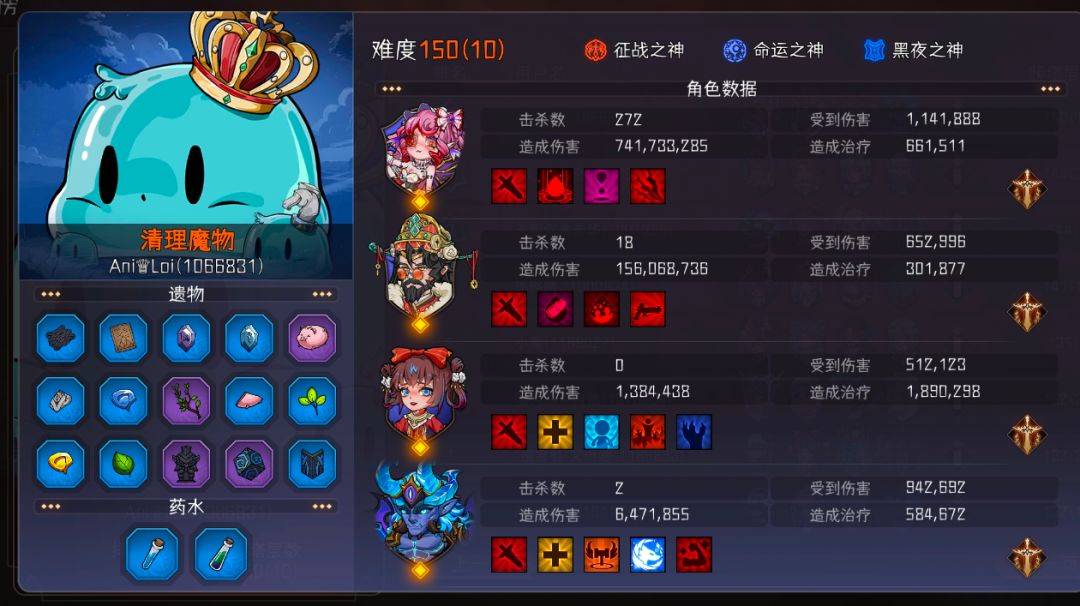 全自动核心角色:小鹿(零命即可,紫色应该也一样);核心遗物:混乱魔镜(紫色即可)非重甲血多怪基本都能在控制叠高小鹿控不住之前杀掉,重甲血多的都是笨笨除了多挨几次揍废点时间其实是最没威胁的。视频里是150难第,12场战斗不说是上限吧,起码也能算150的标准难度了。 全程手动选技能词条和遗物,战斗全自动。 图里的效率咱也不知道在各位眼中算不算墨迹,个人觉得还好,打重甲怪回合数要多点但是重甲全是靶子連近