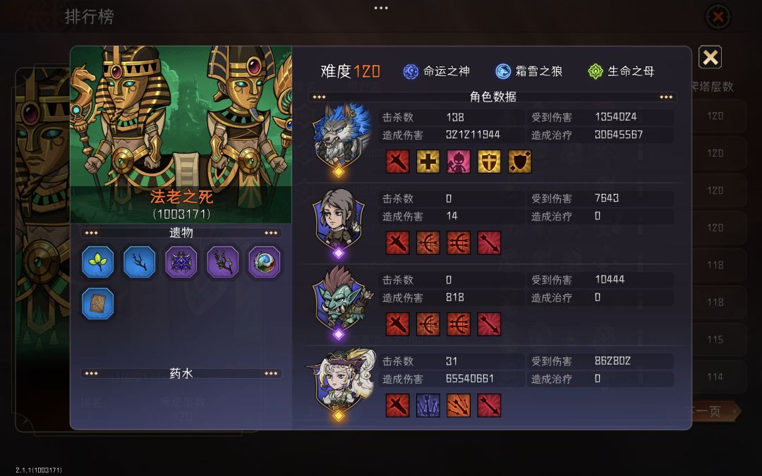 【已过150难度】 找了好久都没有找到小鹿的攻略我就自己拉一套装备试试看,感觉还可以150能打440万伤害 在100层刷装备能打最高1000-2000万伤害 〔面板展示〕 ps:自动过五六次101没翻车,boss全抢,如果遇见药水商人有可能会翻车,因为有迷惑药水,其他都还好 —————————————————————— 【装备圣物选择】 已试过面纱圣物应该高于穿刺圣物的伤害,项链带普攻项链,戒指带