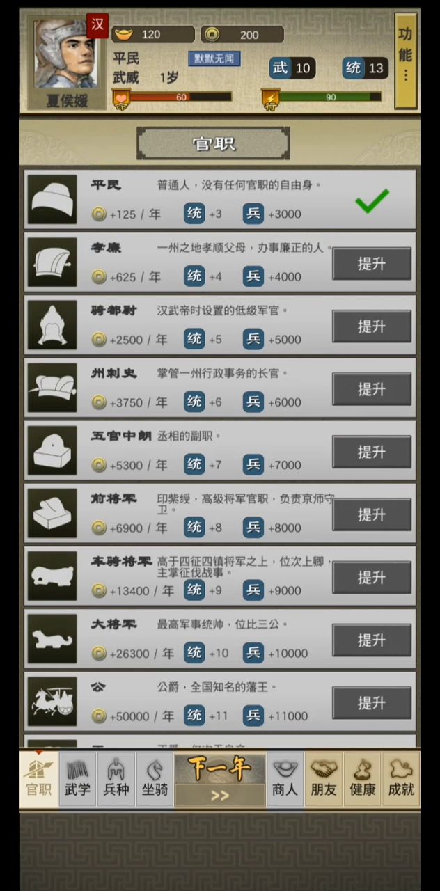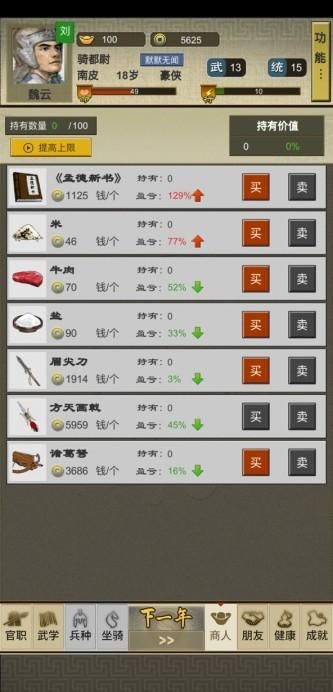 玩完了,感觉可玩性一般呀,就是简单xx人生加了三国的框架。跟历史武将互动没啥特别的东西,结婚系统目前几次同房也没生孩子;战斗系统,等你马和武力学全基本无敌。不能造兵,兵力不能选择没有战斗画面。商业系统略显简单,应该每个城市都有不同的东西来买卖如果能做到跟武将互动然后招揽他,带着武将打架攻城,战斗系统再丰富些,操作再多样些,比如投敌叛变自立为王这些东西就更好了