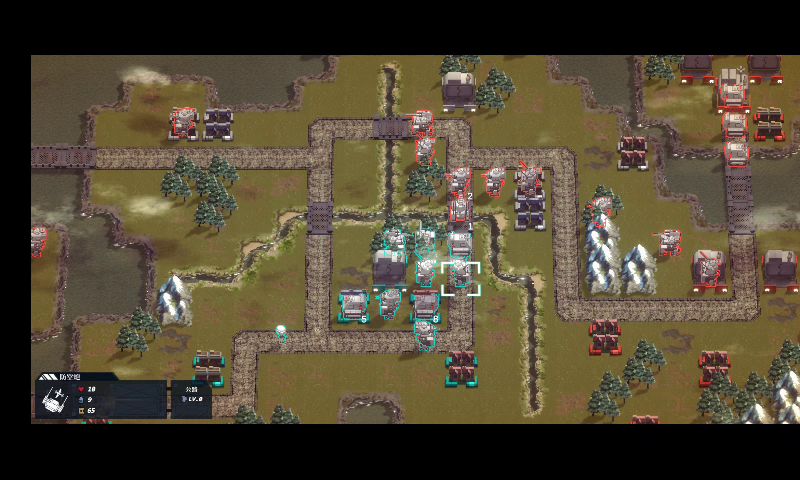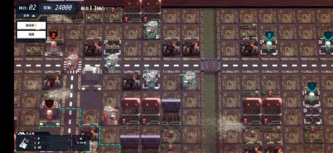 第九关相较于无法产兵并且防守两路的第八关来说要简单不少,开局照着视频中的做法移动士兵到河上位置即可转移敌方将领仇恨(注意第一回合一定不要点击那个飞机,会转为敌方单位的),然后利用敌方装甲车无法攻击且喜欢骑脸的特性😂 卡住桥口即可安稳过关