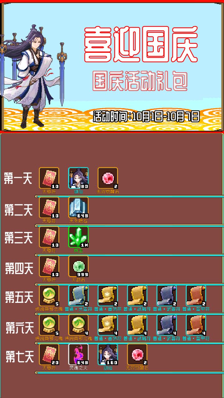 轻松愉快的国庆假期就要来啦,为了满足各位勇士爆肝游戏的心愿,我们特此准备了7天连续大礼包,每日登录游戏即可领取当日福利!【活动时间】2022年10月1日—10月7日【领取方式】当日登录游戏商城-限时即可领取【礼包内容】