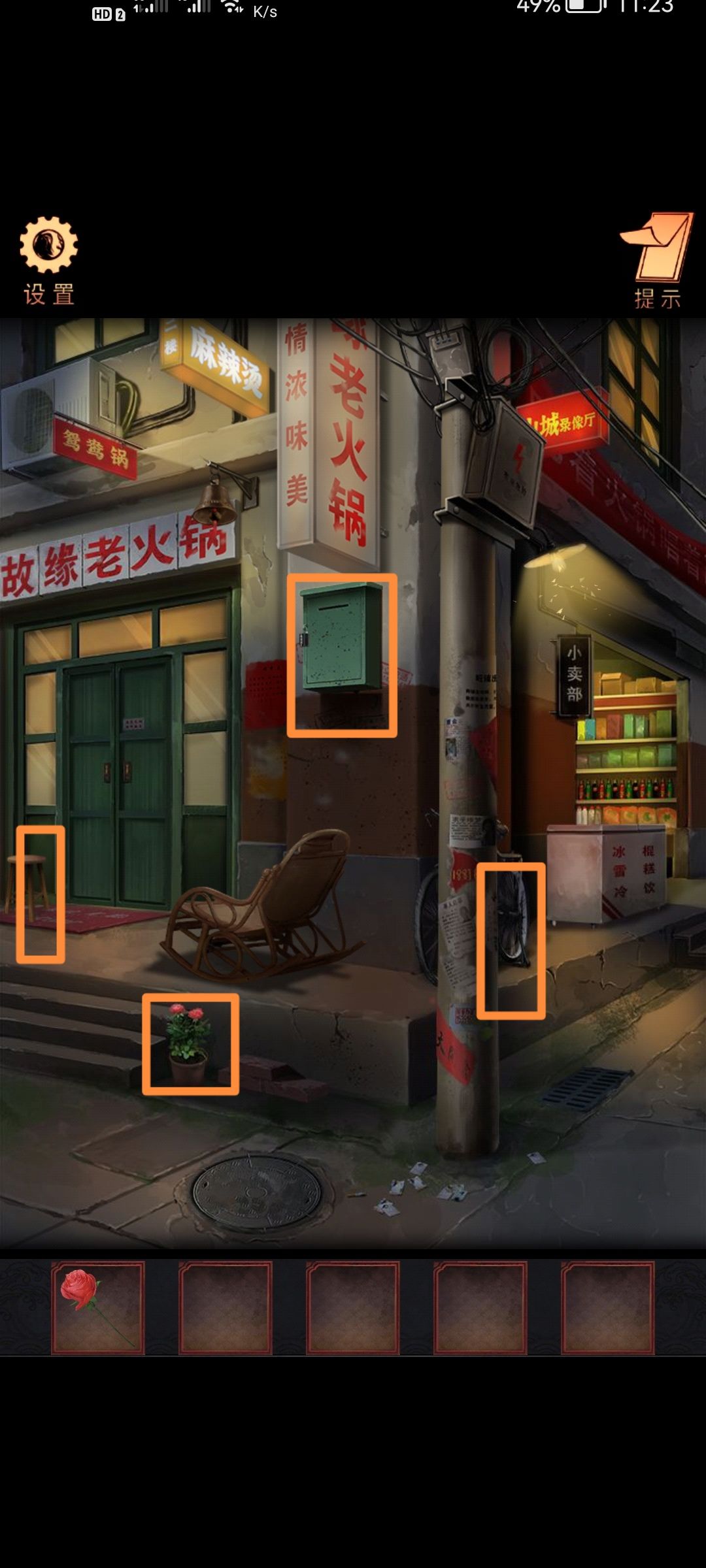 从花盆里得到花,点击单车转动车轮,得到蓝4绿3红9,打开绿皮箱子,得到磁铁 点击凳子敲响铃铛 左下的柜子根据箭头指向的顺序,得到酒,然后去右边祭拜神,往酒杯里倒酒→把花插在瓶子 点击老板娘身后的柜子,使用磁铁,得到钥匙 进去吃火锅 煤气瓶根据墙壁上挂的顺序(打一个结代表第一个) 根据窗户上的字,打开柜子得到油提子 进入后厨,点击柜子用钥匙打开,再用木提子得到香油 根据干货食材,拉所圈的那几个鞭炮→