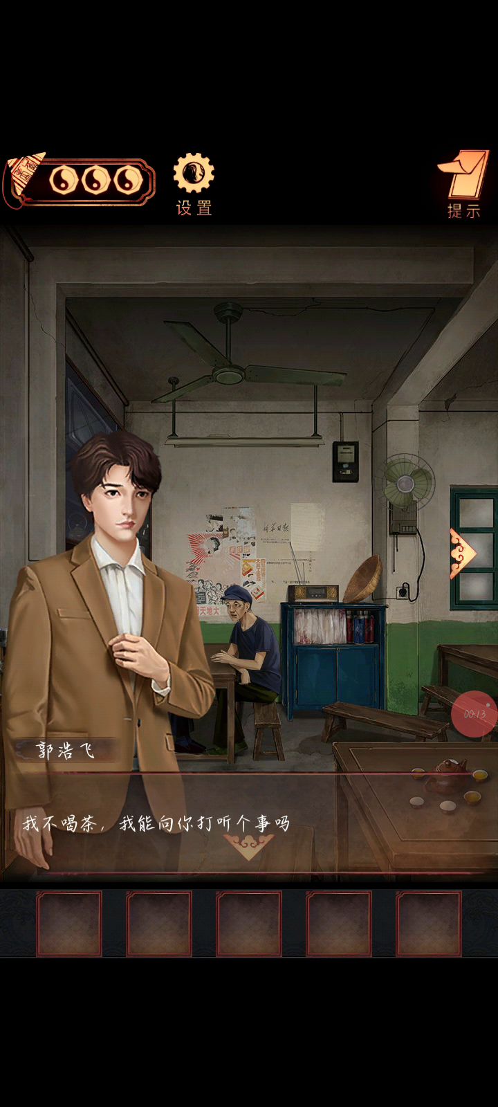 第六章:惊魂渡1.(巷子)点击麻将馆的窗户,翻转玻璃窗,查看玻璃窗两面的麻将及其连线走向,得出规律(七筒指向八万,八万指向五筒,五筒指向幺鸡,幺鸡指向八条,八条指向一筒,所以顺序就是七筒八万五筒幺鸡八条一筒)2.点击麻将馆门口的机关,把麻将调整为:七筒八万五筒幺鸡八条一筒,打开门3.(麻将馆)进麻将馆,触发剧情,获得【笔记】和【钥匙】4.在柜子上获得【水壶】5.点击左边的麻将桌,获得线索