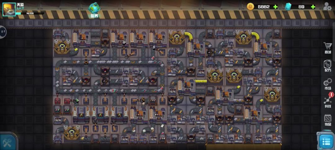 ❤️总体思路:开地,开地,还是开地。 开地需要啥?🤔金币、土地升级券、物品。 怎么获得这三类游戏资源? 1️⃣、需要物品,就建造生产线生产,新人引导会教你怎么建造一条简单的生产线。工厂几级就是几线程,即能同时生产几种物品。图2中熔炉是2级,同时生产铜线和铁片。 2️⃣、研究科技可以解锁物品和建筑。科技依次按顺序解锁,下面一排副科技(子弹和芯片)没开完地前,不用解锁,前期没啥用。⚠️新人建议看广告尽