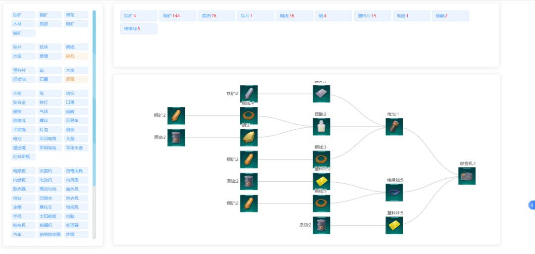 v1.0:选你要造啥,告诉你需要啥原料 v2.0:加上了配速功能,鼠标悬浮查看 v3.0:提供了数量设置功能,并且原材料通过颜色区分,更加直观 v4.0:添加了悬浮查看可生产的高级物品功能,添加了导出文本功能,添加了效率配速功能,添加了布局模拟功能(还不完善)