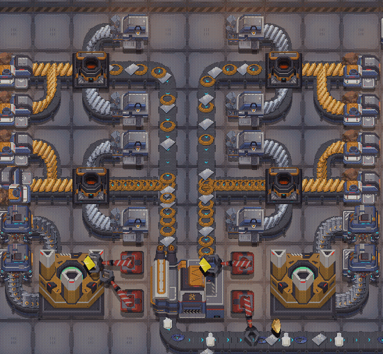 初级成品车间配四个冶炼车间,镜像两个工厂一组中间两个高级储物间,给料木板,给料硫两侧各一个筛选机械臂,搬运塑料片主要生产 铁锅,绝缘线,硫酸。其他铁制品按需生产初级成品车间配2个棉花2个木材1个石油生产 木板 纺织 口罩化工车间配4个石油1个木材生产 塑料片 硫 石墨冶炼车间配铜铁硅各1个生产 铁片 铜线 水泥新增更省地模块两个镜像一组4*12