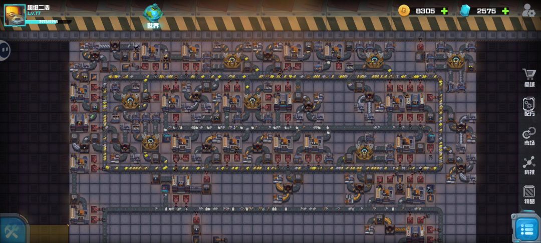 现在这个流水线暂时没有建完,但是整体思路就是这样,最上层大圈是基础材料圈,工厂放置思路,最上面是生产初级产品工厂,主要功能是少量赚钱,以及帮助消化传送带上的部分物资,次级产品和高级产品做环套环的传送带设计,因为部分次级产品和高级产品需要用到初级物资或者部分高级产品本身就要消耗次级产品,所以做一个环套环的流水线利用地下传送带,目前这套策略的问题相对来说,生产效率和物资,产线的利用率是最高的,就是不足