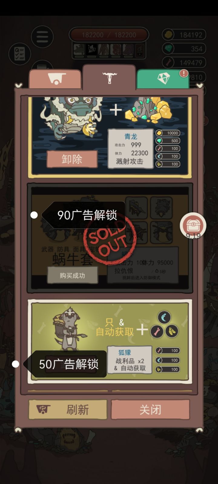 开局建议直接把广告看了。😂50个广告!解锁狐蒙!材料从此不用愁!!!90个广告,解锁最强装备。不过装备不重要,打怪角色基本不上,用材料换个防具防止被秒就行了,广告看完,直接用钻石解锁完30个宠物格子,剩下的钻石,可以抽面具,也可以后面换金币。左上角的任务不用管也行,反正给的资源也不多。地图探索沿着边界走,有传送点就解锁,遇到新怪至少打3个。最后几个boss不好打,一个一个来,多试几次,运气好就过了。