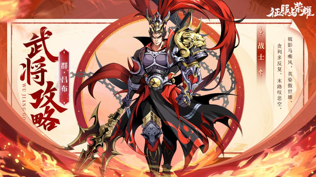 马中赤兔,人中吕布! 在我们浩瀚的历史长河中,吕布可谓是武艺绝伦。无人能敌位列第一的武将,须得关羽、张飞、刘备三人合战才能抵挡,正所谓流传至今的“三英战吕布”的故事流传至今,他的独特兵器方天画戟更是所向披靡,战场中是令敌人闻风丧胆的存在。 他在【征服与荣耀】设定中也充满了战斗、情感和对自我价值的追求,展现了他作为战士的荣耀和对美好事物的渴望,下面来看看他是如何成为了一个令人敬畏的武将吧~ 英雄