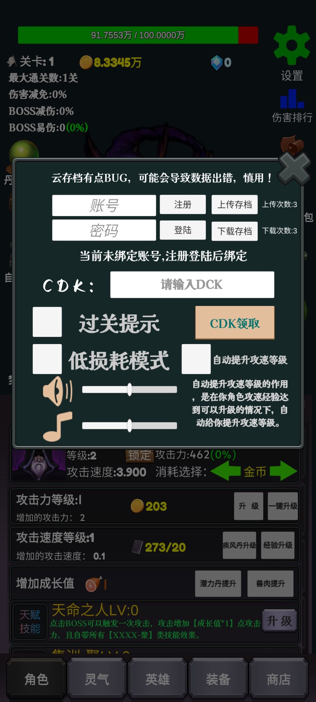 绝对够细,萌新请进,多图恐惧慎入,大佬爱来不来 首先,打游戏最重要的一点就是打开游戏,对吧 进游戏的界面有群号,加一下,可以领各种福利对换码,还有各种黑丝,白丝,肉丝 少废话 上图 进入后会有新手教程,跟着提示点完,打开右上角第一个,就是这个界面,注册个账号,然后下边的过关提示,低损耗,自动攻速全部打钩,喜欢背景音的可以把声音开到最大。再然后就是把你从群里搞到的各种兑换码兑出来,关掉这个界面 打开
