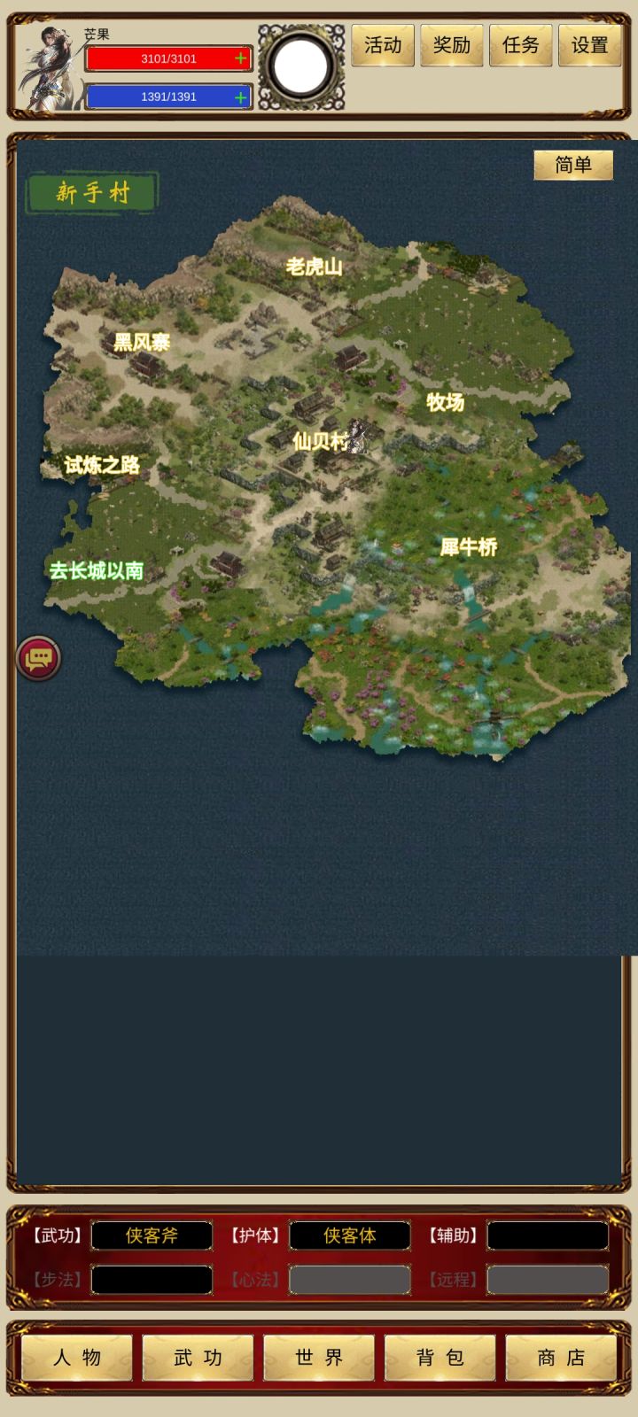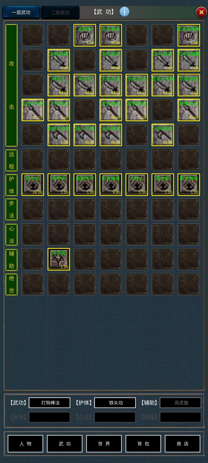 首先说明 这是一个慢热游戏 真慢热游戏本游戏没有充值界面 装备 武功 一切靠自己打里面有几个重要的先介绍下一 是武功 左边的是轻武功 攻击速度快 伤害低 右边是重武功 伤害高 攻击速度慢二 破禁符 这个是刷副本有的 每天破禁符一定要领满 后期没有服 装备都不好爆三 护体 加防御 本游戏防御越高越好 护体只能在线练 被怪物打掉血量十分之一 就涨护体四 侠客信物 这个前期不考虑 后面练满几