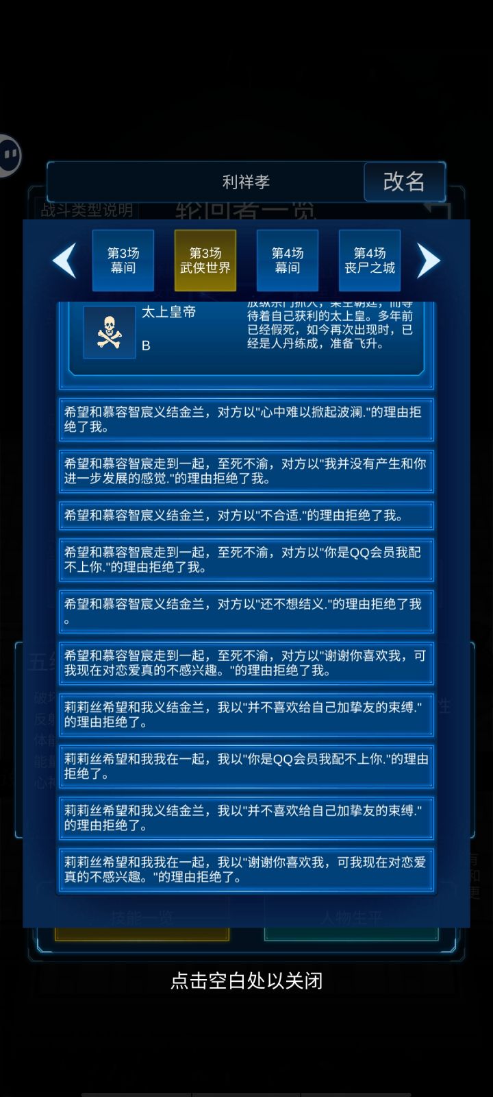 分享一下我队伍里的老大哥,突破如喝水,真正的天骄。这是第二批队伍了,第一批队伍全被少林和尚砍死了,我想着报仇雪恨,刷了两场就继续去打这个位面,但是误入隐藏剧情,还好有这个老大哥坐火箭一样突破,不然可能全军覆没,但最后打太上皇还是只剩下四个修真者了。但是老大哥人挺幽默的,不是在被拒绝的路上就是在拒绝的路上😂。
