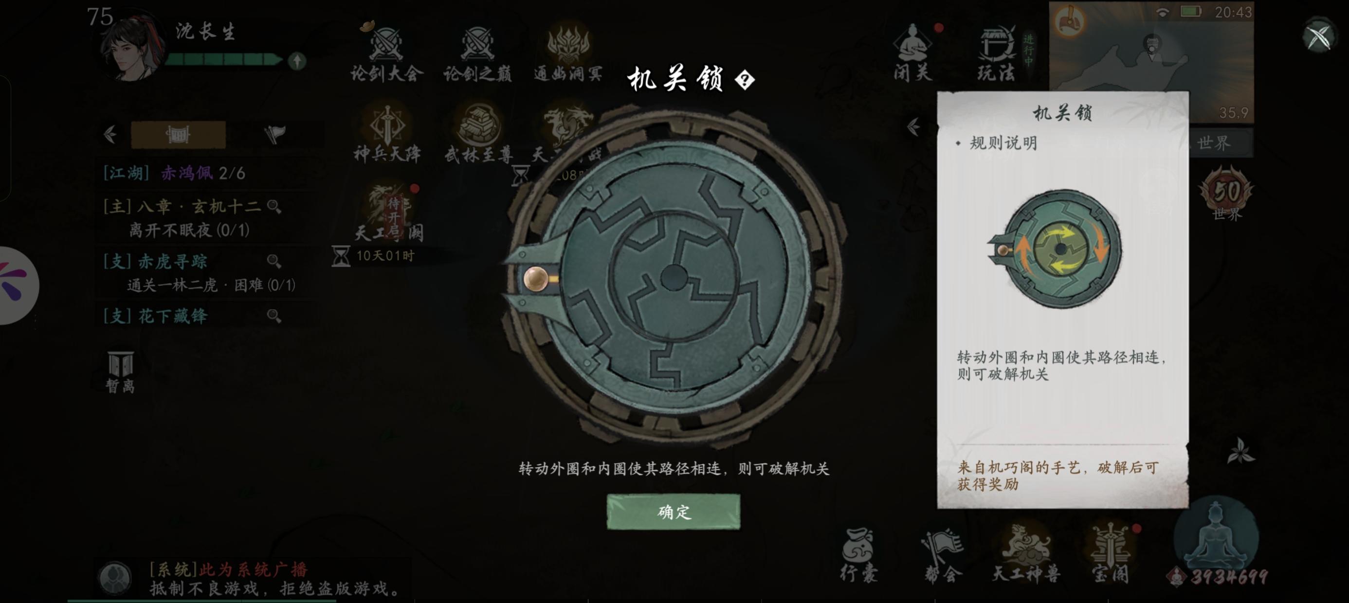 黑白锦里, 璇玑的烦恼(前置功法:武当绵阵), 门派挑战(前置武当长拳), 观剑(前置功法:八卦剑阵), 玄学大师, 观瀑布, 龙与蛇(前置:游龙剑法) 掌门考核 封流云往事(前置梯云步) 流水之意上(前置游身绵掌) 流水之意下(前置游身绵掌) 自由之鹤(前置鹤形十三式) 迷障重重 唐门探索12个 流荧飞蝶 暗中窥探一(前置流风回雪) 神秘药方(前置电光火石) 暗器之争一 暗中窥探二(前置流风回雪