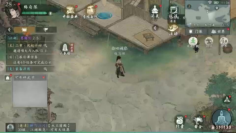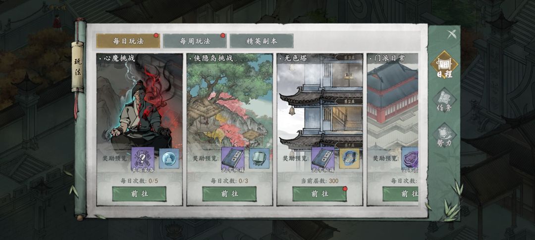 #墨剑江湖攻略 大家好,我是6区的江月待何人,今天带来的是日常任务篇-每天需要完成的 一.活动总汇 分为每日玩法,每周玩法,和精英副本(俗称团本) 每日玩法分为心魔挑战,侠隐岛挑战,无色塔,门派日常,扶光塔,比武论剑,悬赏,江湖往事, 接下来我一一说明 (1)心魔挑战----装备和经验的主要来源 第一天0氪无压力通关,就是用前期的阵容,主角,萱萱,大力,凌霜,因为现在改版,变成每日免费5次,可以
