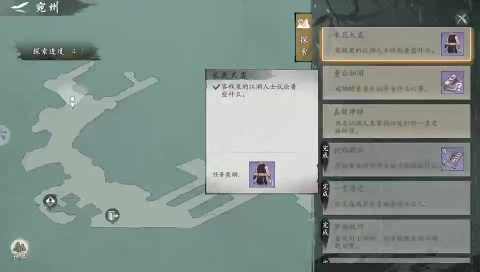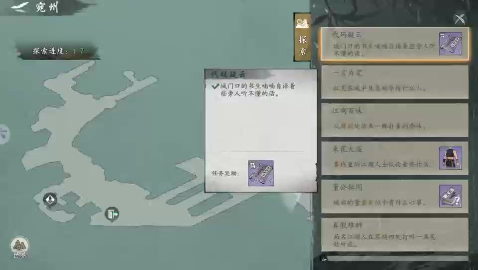 部分内容可能会有变动,如果有发现不对的可以在评论区和我说哦(有小礼相赠[表情_举手]),我来修改一下,谢谢大家的支持~ 董候秘闻 先在宛州城【地下水道】→【水道绝境32_21】【地下陵墓38_9】【运河画舫20_28】的副本里找道具 然后和宛州城河边的钓鱼人说话(坐标:7_21) 最后去武当侧峰(即论剑峰)找宝藏(坐标:论剑峰20_50) 代码疑云 宛州城门口茶摊找李大白对话(宛州3_2) 赠送菜