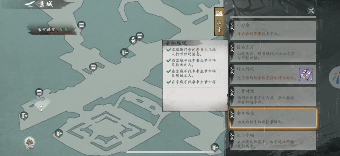 京城主线 共有12个任务 1.人自为斗 这个没有难度,跟着任务走就行,有自动导航,不需要其他操作 2.今古端倪 这个稍微有点难度,需要先去(84.6)找李书生,对话完毕后需要找3个人,画店老板,悬赏侍卫,孩童小八坐标分别是(13.25)(77.11)(8.49) 最后再去宛州城找李大白(3.2) 3.雀巢咔咔飞 先找商人触发任务前提(18.19),然后就开始了找窝行动,第一次在(85.32),第二