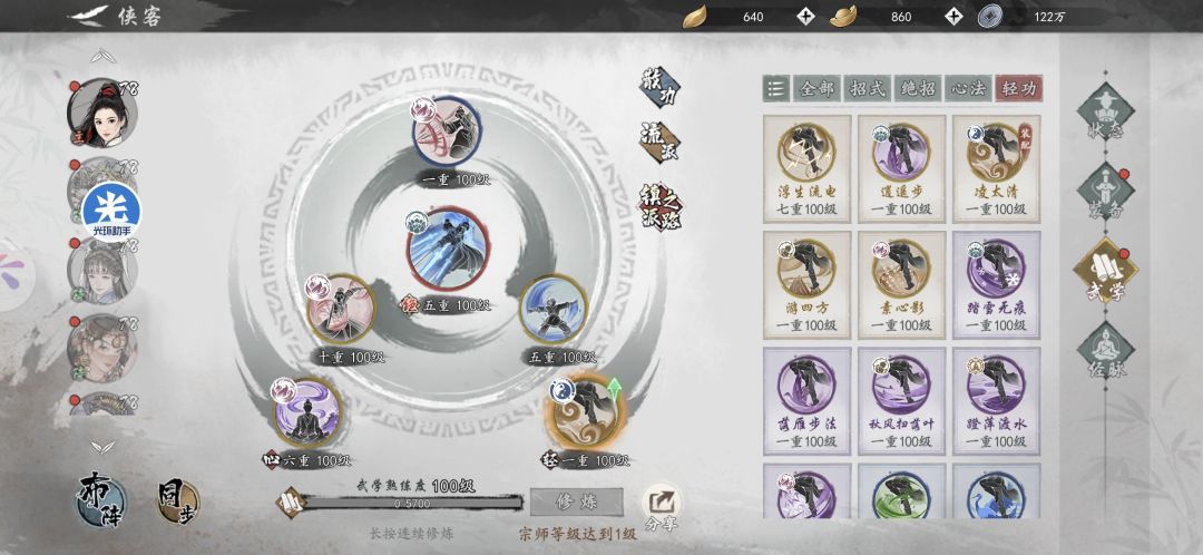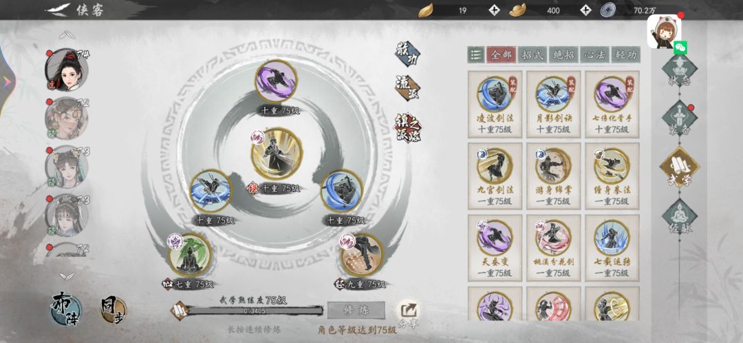 新研究的内劲流派,我玩内劲流派除了泄气流全部换了一个遍。经过多方实验搭配出这一套化劲闪避金针流。大家感兴趣可以去试试。 招式:月影剑法+七伤化骨手+凌波剑法 绝招:峨眉金针(镇派) 心法:诡道+素心影 存活方面选择了闪避流,这应该是内劲最优秀的存活机制了,月影+素心影能极大程度增强存活率。 伤害方面通过月影跳进人群,七伤给一圈敌人挂上化劲,素心影除了闪避还有百分之几十的暴击率,化劲是可以暴击的。 凌