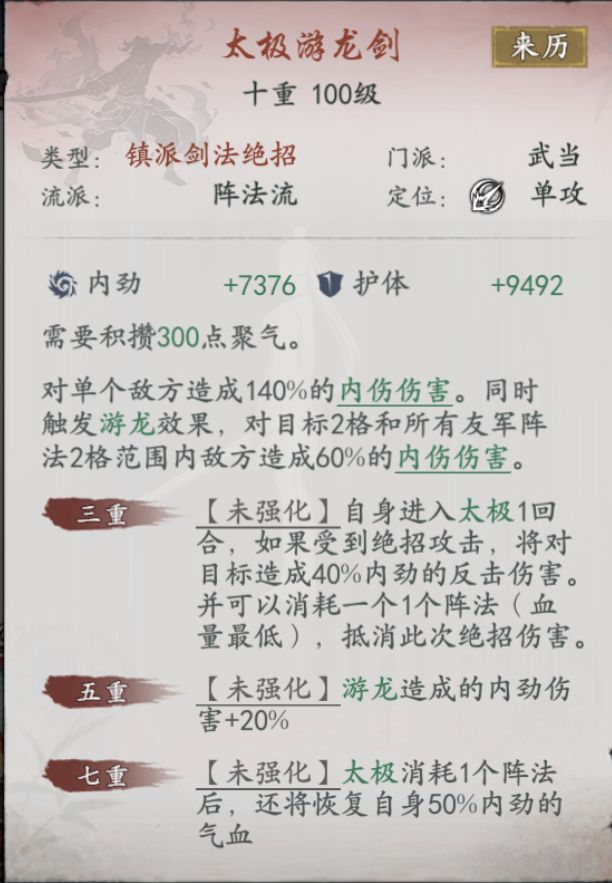 前言:在这高攻击高伤害的版本,几乎全部流派是不需要肉盾输出来挡伤害的,下面讲的是最新武当拳玩法。 首先武当拳已经很多个版本没有崛起了,甚至很多人都忘记了还有武当拳,接下来就我为大家带来超爆发武当。 技能一:五弦针 效果:我方随从包括自己,每次行动都可以触发主角最高60%内劲给单个敌方造成伤害=60%内劲x4人x3回合=理想伤害是720%主角内劲伤害 (因为这个技能算主角的回合可能主角速度快