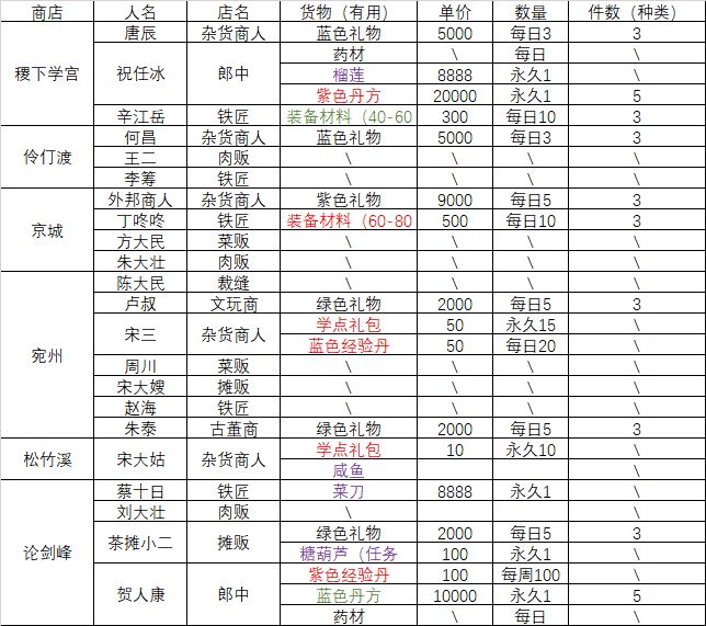 稍微整理了一下,标红的是我认为中期很重要的,前期能买就买,特别是紫色丹方,自己一开始玩的时候不知道🤷少吃了好多。经验丹和学点也是能买就买,70级往后侠客和主角登记差太多了,很掉战力。标绿色的是前期可买可不买的,紫色是武器外形(只是我知道的,欢迎补充)