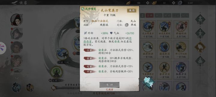 大家好,在下6区雕郎。今晚维护中,夜不能寐,便把这几天的心得写一点。提前声明:我所说的一切都是关于功法搭配和随从搭配,不要有杠精来跟我说神兵什么什么的。不知道有没有人在看到天涯浪迹刀极其镇派的技能效果后产生了兴趣,本区已经有两位有一定氪度的佬试图转天刀,大概是72级四百多万的战力。分别由连击剑和峨眉剑转的天刀,目前均已放弃。原因如下:第一位佬由连击剑转的刀,但是功法实在记不得了,好像是