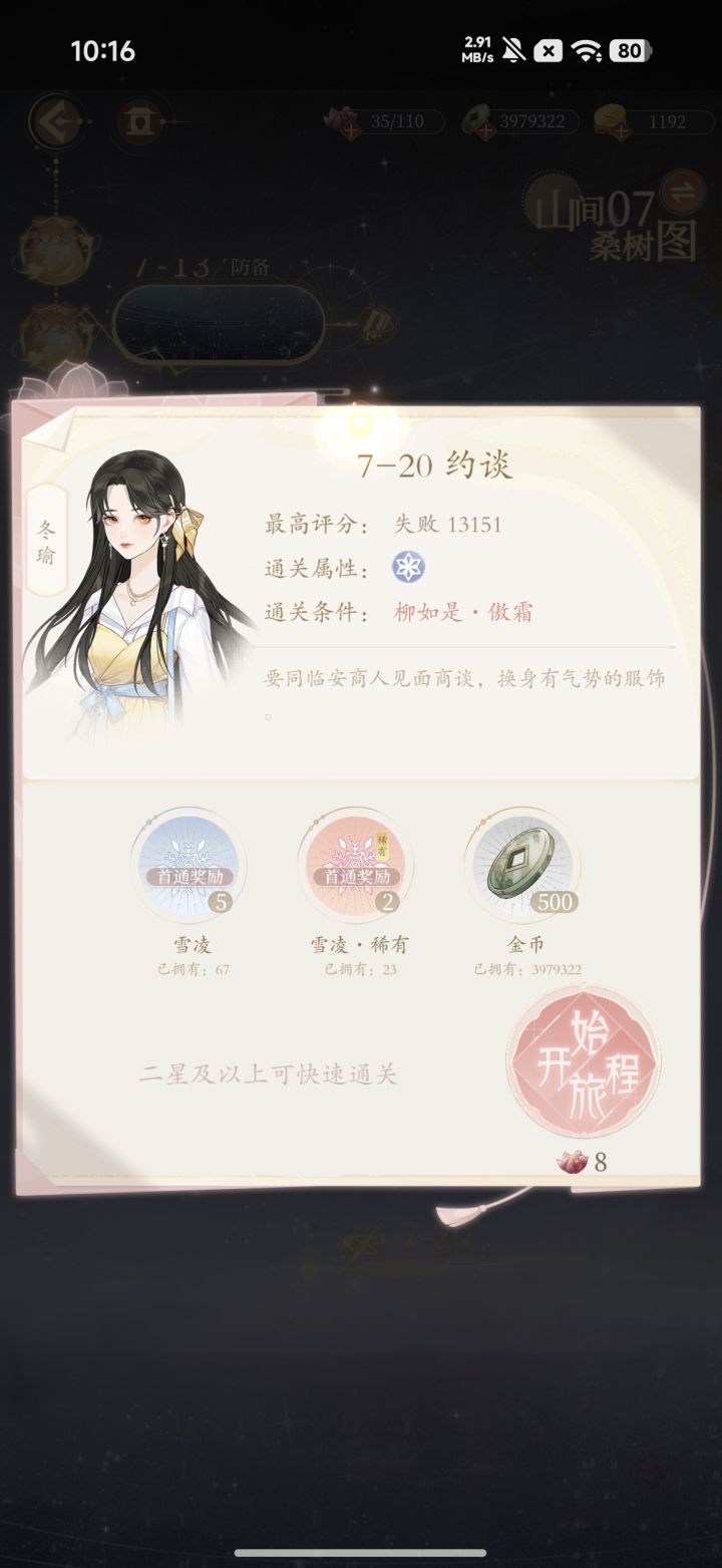 第六章开始风和雪卡一二星过,第七章更是擦边过关都过不去,雪卡是喜鹊登梅,风是少年游(皎皎那套),想抽圣光补雪属性但听说新年有新衣服(不知道是不是复刻还是新的,暂时攒着马蹄金)顺带吐槽,这主线设置真是离谱,为什么有必穿了还卡关。。。对新人和缺词牌和衣服的人来说真的很不友好