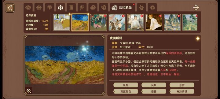 它的基础逻辑是拿画作赢得馆长们的认可并获得资金,而资金又投入到抽卡来添置升级画作以达到更能触动观众的作用。关卡的设计是简单的三消机制,然而科普的环节藏在赏析画作并完成标签,并据此推测观众的MUCCY中。既不显得冗长艰难,又足够吸引玩家的兴致去了解画作的基本信息。趣味性的科普环节和休闲的游戏环节交错出现,很难造成兴趣疲劳。游戏塑造了部分或丰满或扁平的角色,铺就了一些故事性恰到好处的剧情线和人物关系,其中一部分台词很能触动我。游戏画面生动活泼,音乐舒缓,可以收集展馆物件和欣赏各异的风景。也许他不会是你玩过最震撼你的,但会是最让你舒心,也是最语重心长的。