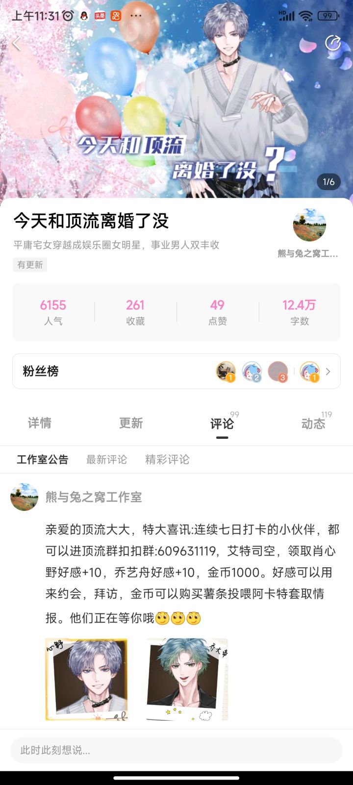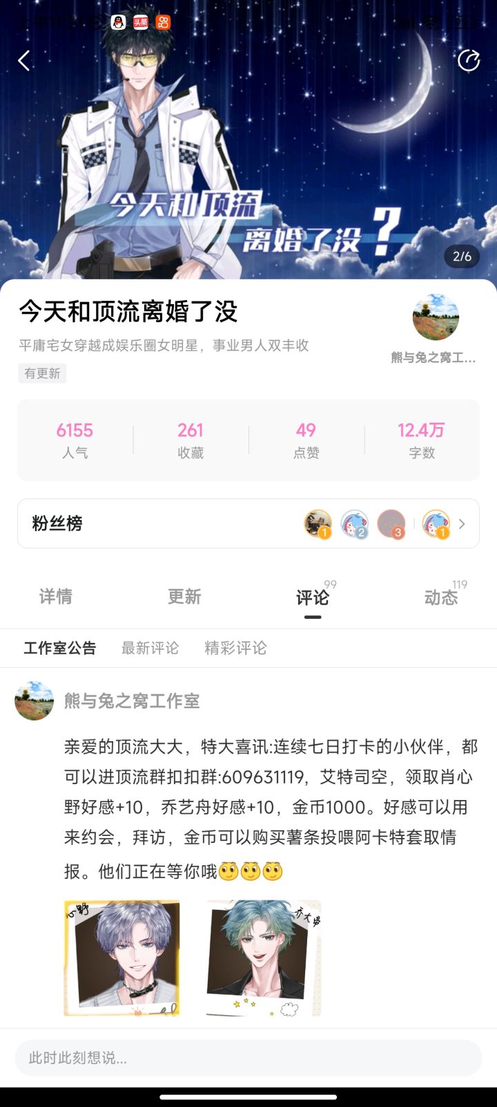 亲爱的顶流大大,易次元APP版《今天和顶流离婚了没》送豪礼了!特大喜讯:连续七日打卡的小伙伴,都可以进顶流群扣扣群:609631119,艾特司空,领取肖心野好感+10,乔艺舟好感+10,金币1000。好感可以用来约会,拜访,金币可以购买薯条投喂阿卡特套取情报。他们正在等你约会哦[眨眼][眨眼][眨眼]另外关注官方公告,帮忙宣传的小伙伴,都可以获得亲亲动态图专属剧情,可以永久收纳在【专属剧情】中哦😘😘😘