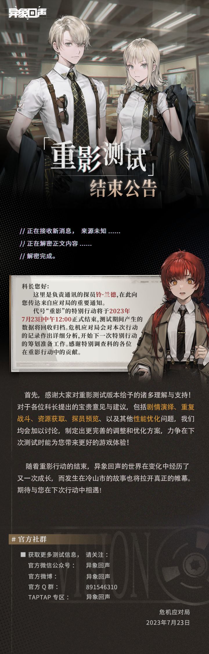 《异象回声》重影测试内容预览PV正式发布,测试招募已经开启! 欢迎来到冷山市,危机应对局需要您的协助!#异象回声#异象回声重影测试