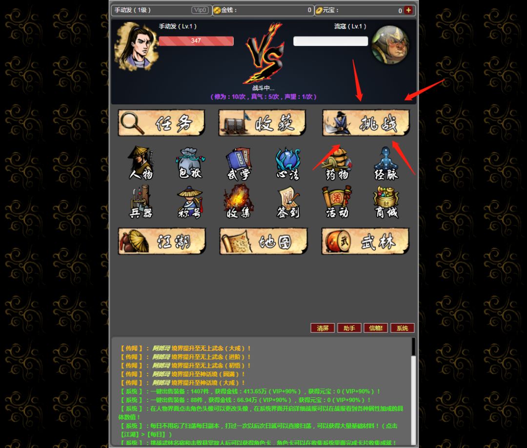 简单攻略: 1、【主线玩法】:出来先点首页的【挑战】随便打两下开启离线挂机功能,刚进游戏等级低装备差打不了几下就会卡住打不过了, 然后回到首页点【收获】,了解一下离线挂机怎么收菜的,以后再点收获要点首页挑战打到不能打为止再去收获比较划算。 简单来说卡图了就去江湖挂机打装备,装备和暗黑一样有随机词条,别问我哪个好请自行判断(或者有个更简单的办法看装备评分)收离线经验升级。 有药材就去点点药材,有真气