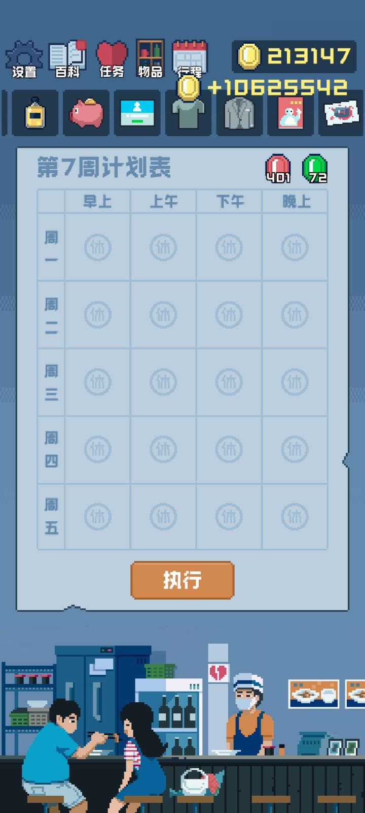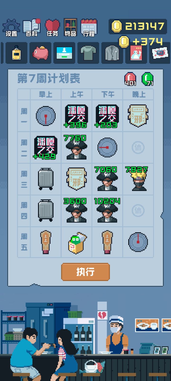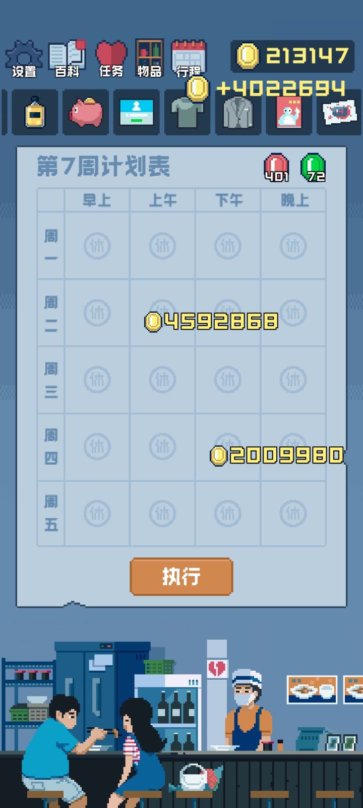 游戏的基本玩法是每周的结束都会随机抽取3选1工作卡,每周开始则从所有工作卡中挑选20张填充日程表并执行工作产生收益,玩家的任务是通过每周的选择搭配卡牌库从而获得最大收益。而游戏的乐趣也就来自于对各种工作卡牌的选择和搭配,所以说这个是类似于低配版《月圆之夜》的策略卡牌游戏。也有人说玩法和steam上的《幸运房东》一样,奈何咱没玩过不能对比。