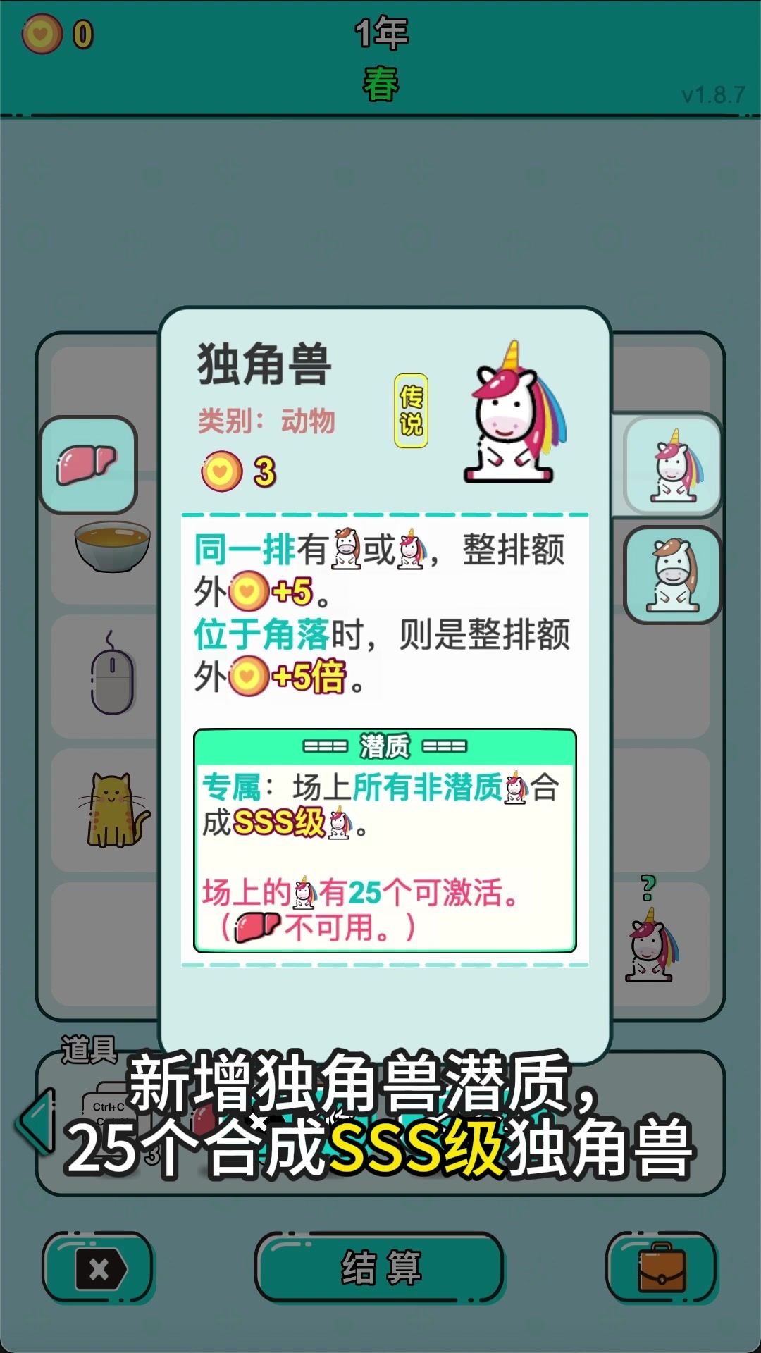 版本1.8.6更新内容: 1、增加熊猫潜质,和角色相邻可额外+2倍收益; 2、增加胡萝卜潜质,每吸收6个已繁殖的兔,+1永久收益,10%几率下次永久收益增加翻倍。 3、增加冰箱潜质,35%几率把史诗以下相邻棋子变为水果; 4、增加投资人潜质,相邻的羊添加羊毛,获得羊毛收益时,36%几率投资收益+50% 5、增加复制潜质,复制时有18%几率+4永久收益; 6、增加复制潜质,复制添加数量额外+1,篮球