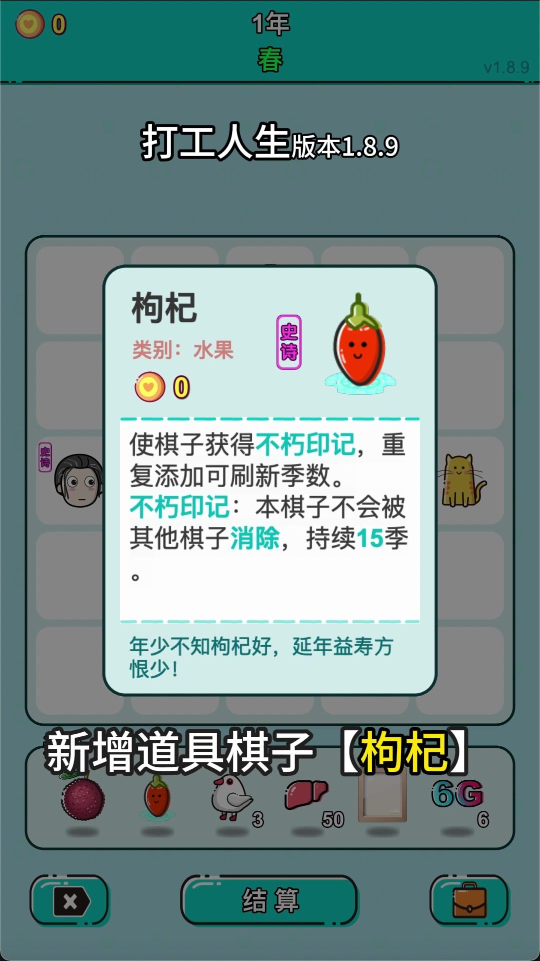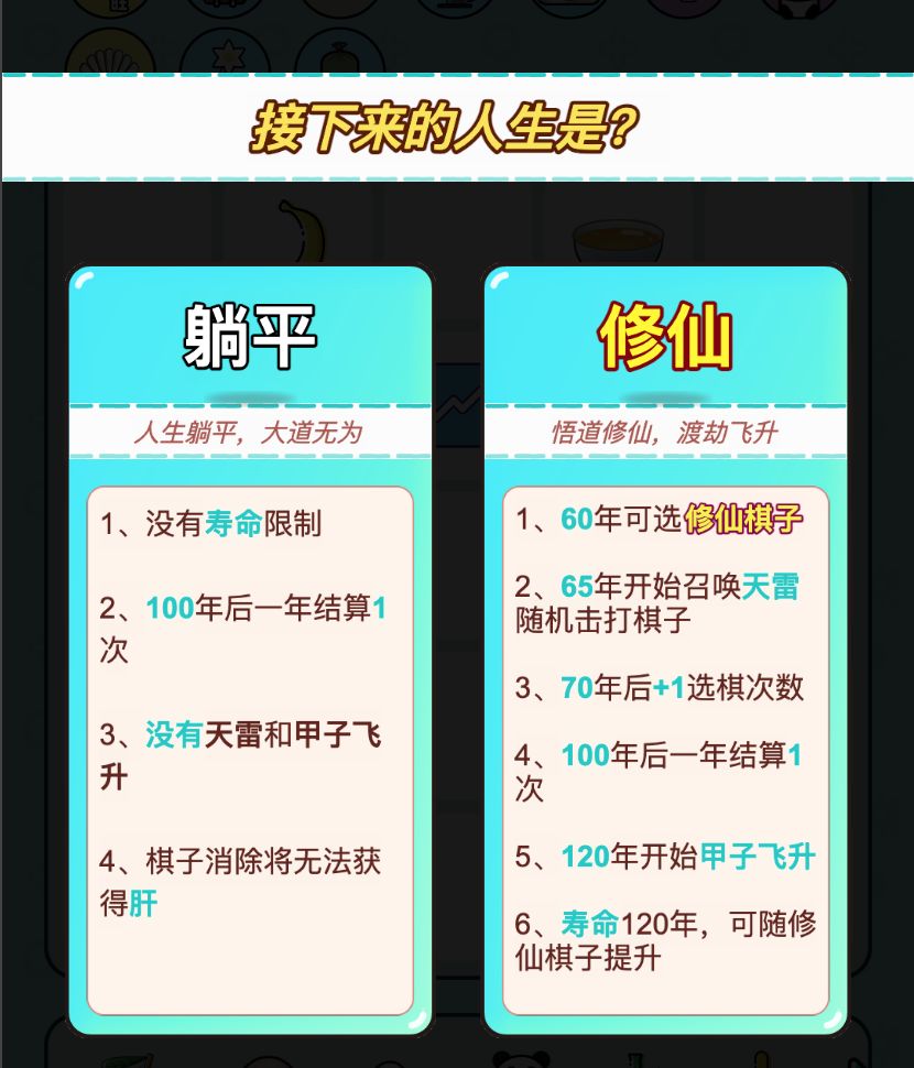打工的尽头是修仙 这是一个有点混乱的版本。好几个新的机制加了又删,不断调整修改,导致有点混乱。 游戏后期有大的机制改动,目前只放出一些大体完成的功能,其他功能会逐渐放出,因此并未对棋子改动太多,所以大家在感觉上,内容体验有限。 新增寿命: 初始寿命120年。年份到达寿命限制,游戏结束。 特别提示:由于增加了寿命限制,若是大家之前累计玩了几百年,甚至上千年,会迅速结束游戏,大家要有心理准备。 新增修